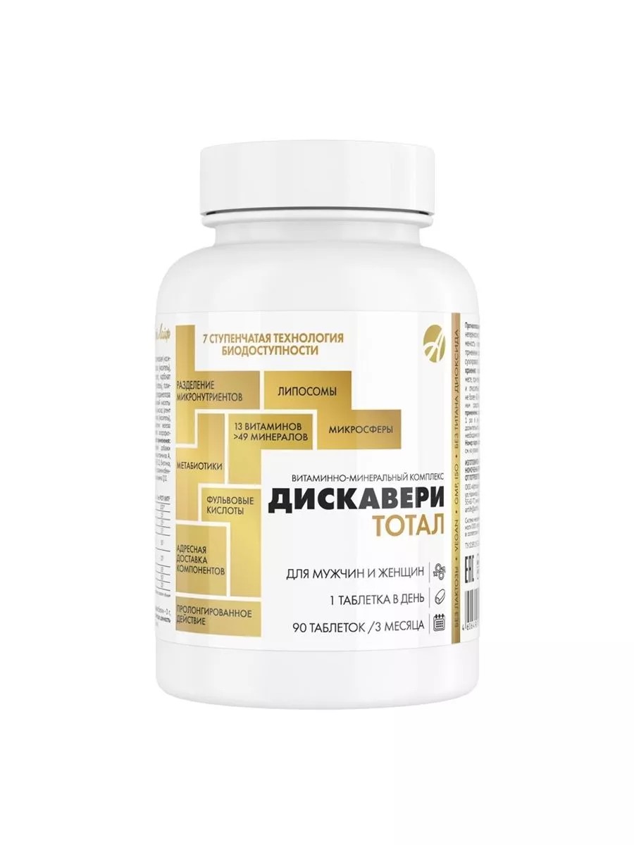 «Дискавери ТОТАЛ» — это новый уровень в эволюции витаминно-минеральных комплексов. При создании продукта были использованы прогрессивные технологические возможности производства, а также учтены механизмы действия витаминов, их биохимические превращения в организме, межвитаминные отношения. «Дискавери тотал» содержит полный спектр нутриентов и помогает качественно устранять дефицитные состояния. Он обеспечивает адресную доставку компонентов, обладает максимальной биодоступностью и эффективностью. Технология медленного высвобождения позволяет поддерживать в крови нужную концентрацию нутриентов без скачков и перепадов. Физиологические дозировки делают формулу БАД универсальной для мужчин и женщин. Комплекс является вегетарианским продуктом, не содержит лактозу, молочный белок, титана диоксид. 1 банка «Дискавери тотал» рассчитана на полный рекомендованный курс приема — 3 месяца.