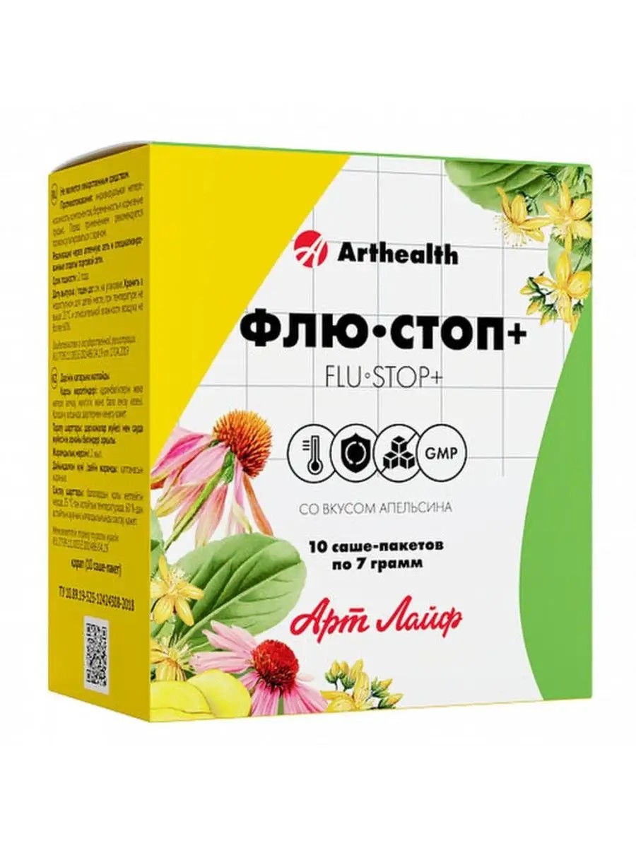 | Trade name | biologically active food supplement "Arthealth Flu-stop+" (Arthealth Flu-stop+) (powder in 7 g sachets, doy-packs, bottles/jars from 14 g to 1000 g with a 3.5 g or 7 g measuring spoon) |