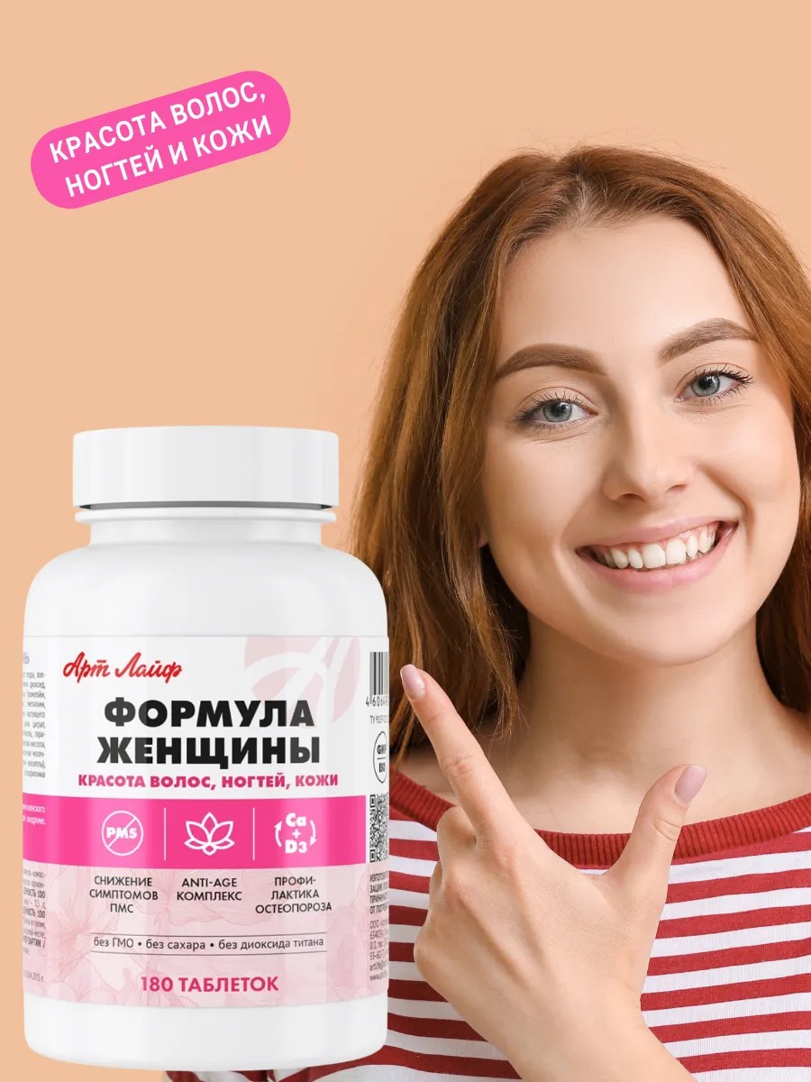 БАД для женщин Формула Женщины от надежного производителя Арт Лайф (art life) - это сбалансированный комплекс, созданный с учетом потребностей женского организма. Способствует улучшению синтеза и сохранению баланса женских половых гормонов, эстрогенов, устранению неприятностей, связанных с предменструальным синдромом, пре- и постклимаксом. В качестве профилактики воспалений женской половой сферы. При сухости кожи, ломкости волос и ногтей. Нормализует минеральный баланс в организме и рекомендован для профилактики заболеваний, связанных с изменением гормонального фона: остеопороза, опухолевых заболеваний груди и половых органов. Растительные экстракты, минералы, витамины и аминокислоты благотворно влияют на нормальный обмен веществ в женском организме. Фитоэстрогены расширяют сосуды, что снижает болевые ощущения, спазмы и судороги, связанные с предменструальным синдромом.