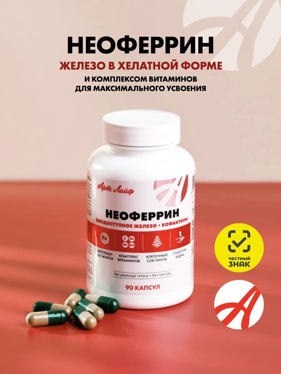 Неоферрин от Арт Лайф - это комплексный препарат, который содержит все необходимые компоненты для борьбы с железодефицитной анемией. Основой данного препарата является бисглицинат железа (хелат железа), который с легкостью усваивается организмом благодаря содержанию витамина С. Кроме того, в составе препарата присутствуют витамины B6, B9 (фолиевая кислота), B12, а также марганец и медь хелат, которые активно участвуют в синтезе гемоглобина, эритроцитов и обеспечивают антиоксидантную защиту организма. Недостаток железа может привести к анемии, клеточной гипоксии и системным заболеваниям.