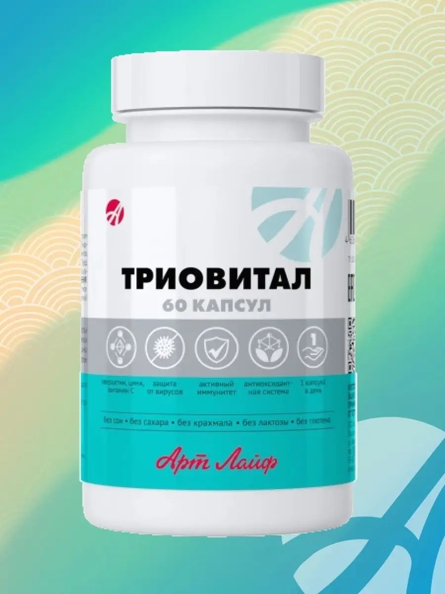 Immune system support. Triovital is a complex for the prevention, reduction of viral load and strengthening of the immune system during epidemics of coronavirus infection, influenza, acute respiratory viral infections, as well as seasonal diseases. Triovital is an immunomodulatory complex created in accordance with the recommendations of international protocols for the prevention and treatment of coronavirus infection COVID-19. It combines several active immunostimulating components - quercetin, zinc and vitamin C, which enhance each other's effects and ensure the high efficiency of the drug. Recommended both in the early stages of the disease - it is actively effective during the incubation period, and during a protracted course of the disease. Activates the body's defenses, preventing further proliferation of viruses; promotes the formation of an adequate immune response to the presence of viruses, without provoking excessive activity of immune cells ("cytokine storm"); strengthens the barrier function of the upper and lower respiratory tract; helps to reduce the duration of the disease and reduce the likelihood of complications; Has anti-inflammatory and antibacterial properties, strengthens the walls of blood vessels and capillaries, and enhances the antioxidant protection of cells and tissues. Action: Quercetin is a flavonoid that helps strengthen the immune system and reduce the inflammatory response to viral load. It strengthens capillaries, reduces vascular permeability, and increases their strength. This natural compound exhibits high activity against a wide range of viruses and upper respiratory tract infections. It has proven effective in the treatment of the Ebola and Zika viruses. Quercetin is a powerful natural antioxidant that protects cells from premature aging and the effects of free radicals. Quercetin can "combine" with zinc and vitamin C and function synergistically, demonstrating a strong immunostimulatory and antiviral effect. When combined with zinc, it improves its uptake into cells, acting as an ionophore. Zinc is one of the key minerals that ensures normal energy metabolism. It is a component of over 200 enzymes and is involved in protein synthesis, cell growth, and differentiation (including immune cells). Zinc is active in tissue regeneration, collagen synthesis, muscle repair, hormone formation, and the proper perception of smell and taste. One of zinc's most important properties is its proven support for the immune system in the fight against viruses and bacteria. Zinc is a powerful immunomodulator that helps reduce the activity of a number of viruses, including coronaviruses, by blocking them at the cellular level and disrupting their replication mechanisms. It also enhances the function of the thymus, the gland responsible for the production of lymphocytes. Effective in the fight against atypical viruses, influenza, acute respiratory viral infections, herpes viruses, etc. Vitamin C has numerous proven biological properties (anti-inflammatory, antioxidant, immunostimulating, antiviral) and is useful both for the prevention and as part of complex therapy for viral and infectious diseases. By stimulating the production of interferon, it provides stable support for the immune system. Reduces the frequency, duration and severity of seasonal viral infections and the likelihood of their complications. Vitamin C is a powerful immediate-action antioxidant that provides direct protection of proteins, fats, DNA and RNA of cells from the negative effects of free radicals. Advantages: consists of natural ingredients; selective activity: the action of the complex is aimed only at the source of infection, without harmful effects on healthy cells; compatible with various means for relieving flu and cold symptoms (antipyretics, expectorants, analgesics, etc.); safety: does not have a negative effect on the gastrointestinal tract, does not create additional stress on the body; suitable for long-term use; Convenient administration – 1 capsule per day. Indications for use: for the prevention and during the acute stage of infectious diseases such as coronavirus, influenza, acute respiratory viral infections, and seasonal colds; as part of a combination therapy for coronavirus infections, influenza, and acute respiratory viral infections; as part of a combination therapy for infectious and chronic respiratory diseases; for individuals at risk due to chronic diseases and age – over 60 years; with a generally weakened immune system and a tendency to frequent viral diseases;* for post-exposure prophylaxis of coronavirus, influenza virus, acute respiratory viral infections, and other respiratory infections; for the herpes simplex virus; as a tonic and an additional source of vitamin C and zinc. Directions for use: Adults take 1 capsule per day with meals. Duration of treatment is 1 month. If necessary, the course can be repeated. Taking 1 capsule (recommended daily dose) will provide: quercetin - 100 mg (333%), vitamin C - 100 mg (167%1), zinc 8.5 mg (57%1).