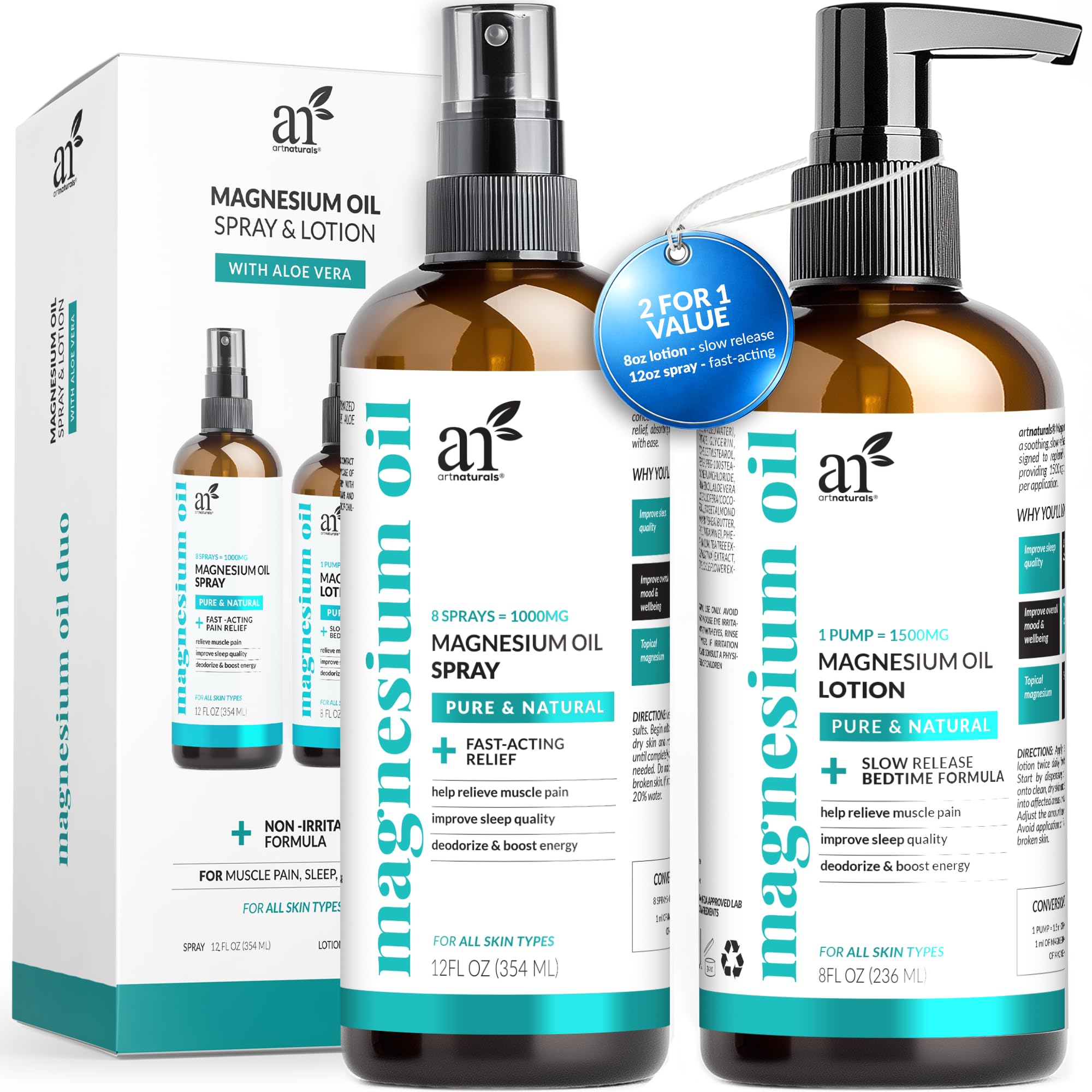 Artnaturals Magnesium Oil Spray 12oz + Body Lotion 8oz Set with Aloe Vera - Pure Topical Magnesium Chloride for Muscle Pain Relief Sleep Support Leg Cramps & Relaxation - Fast Absorbing
