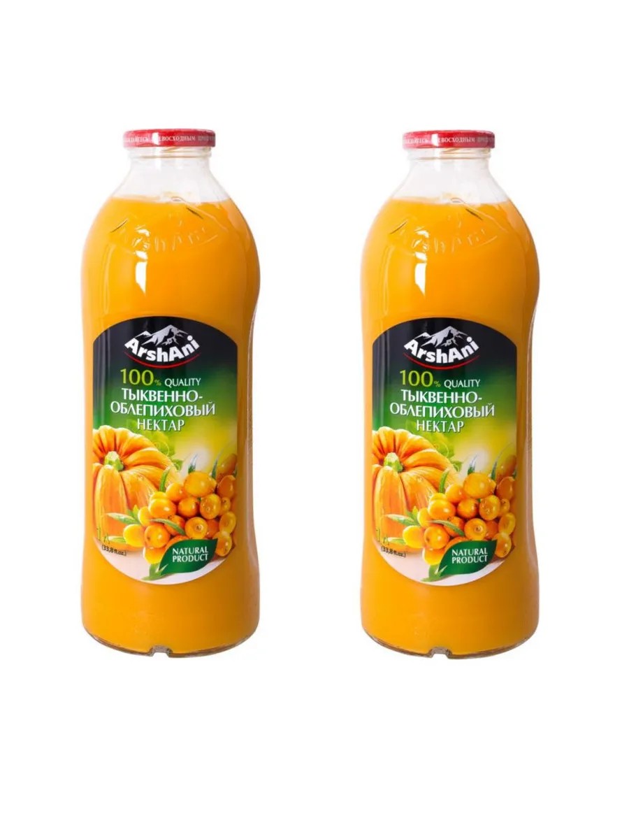 Нектар «Тыквенно-Облепиховый» ArtshAni, упакованный по 2 бутылки по 1 литру, производится в России и представляет собой оригинальный овощной напиток, приготовленный из сладкого сока ярко-оранжевой тыквы и облепихового сока с легкой кислинкой во вкусе.