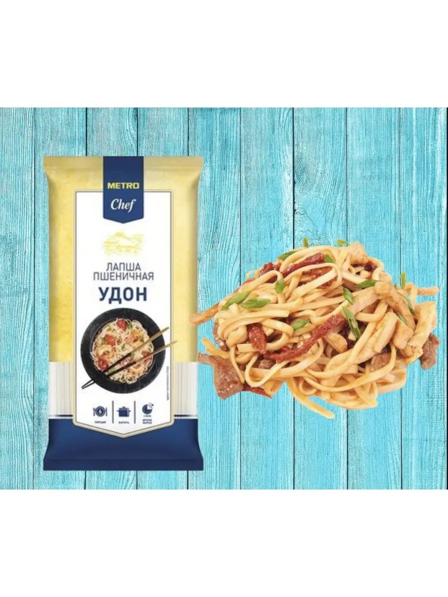Лапша Metro Chef Удон (600 г). Лапша УДОН МЭТРО Шеф - неотъемлемый компонент многих японских блюд. Лапша станет отличным вариантом, когда хочется побаловать себя чем-то вкусным и легким, но нет времени на приготовление сложных блюд. Она отлично сочетается с морепродуктами и свежими овощами, с птицей и всеми видами мяса. Удон особенно хорош в супе мисо, а также в поджаренном виде в качестве гарнира к сашими. Лапша подается как холодном виде, так и в горячем. Японцы считают, что в холодном виде этот продукт освежает в жаркую погоду, а в прохладное время года нет ничего лучше горячего Удона. СОСТАВ: Мука пшеничная, соль, вода.