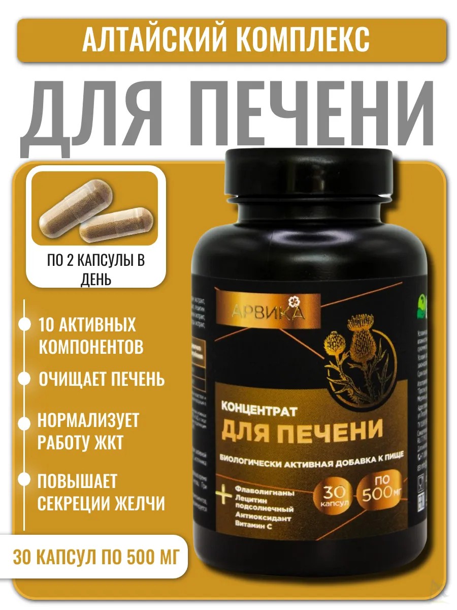 БАД к пище АРВИКА Концентрат для печени 30 капсул по 500 мг — натуральная добавка для поддержки функций печени, детоксикации организма и улучшения работы пищеварительной системы. В составе только растительные компоненты, собранные на Алтае, и витамин С. Все ингредиенты подобраны с учётом синергетического действия.