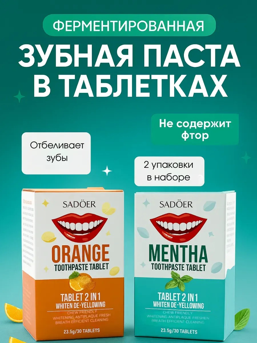 Ферментированная зубная паста в таблетках SADOER Orange & Mentha – это инновационный формат ухода за полостью рта, который сочетает удобство, эффективность и безопасность. В отличие от обычных паст, таблетки не содержат фтор, обладают ферментативным действием и подходят для повседневного использования. Комплексная формула с натуральными экстрактами апельсина и мяты обеспечивает бережное отбеливание зубов, освежает дыхание и защищает от кариеса.