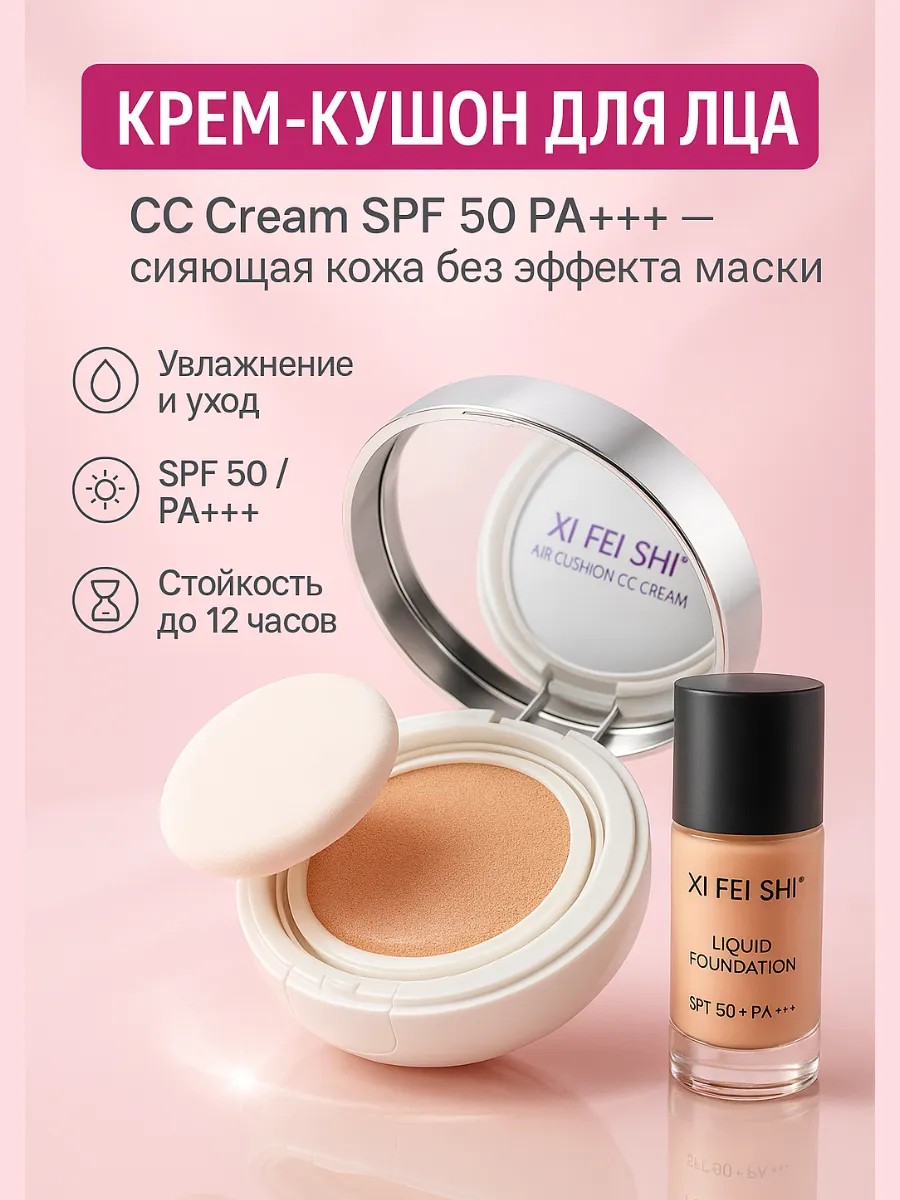Идеальная кожа без усилий! Набор включает тональную основу SPF 50+ PA+++ и Air Cushion CC Cream. Эти продукты обеспечивают стойкое покрытие, выравнивают тон лица и защищают кожу от ультрафиолетовых лучей.