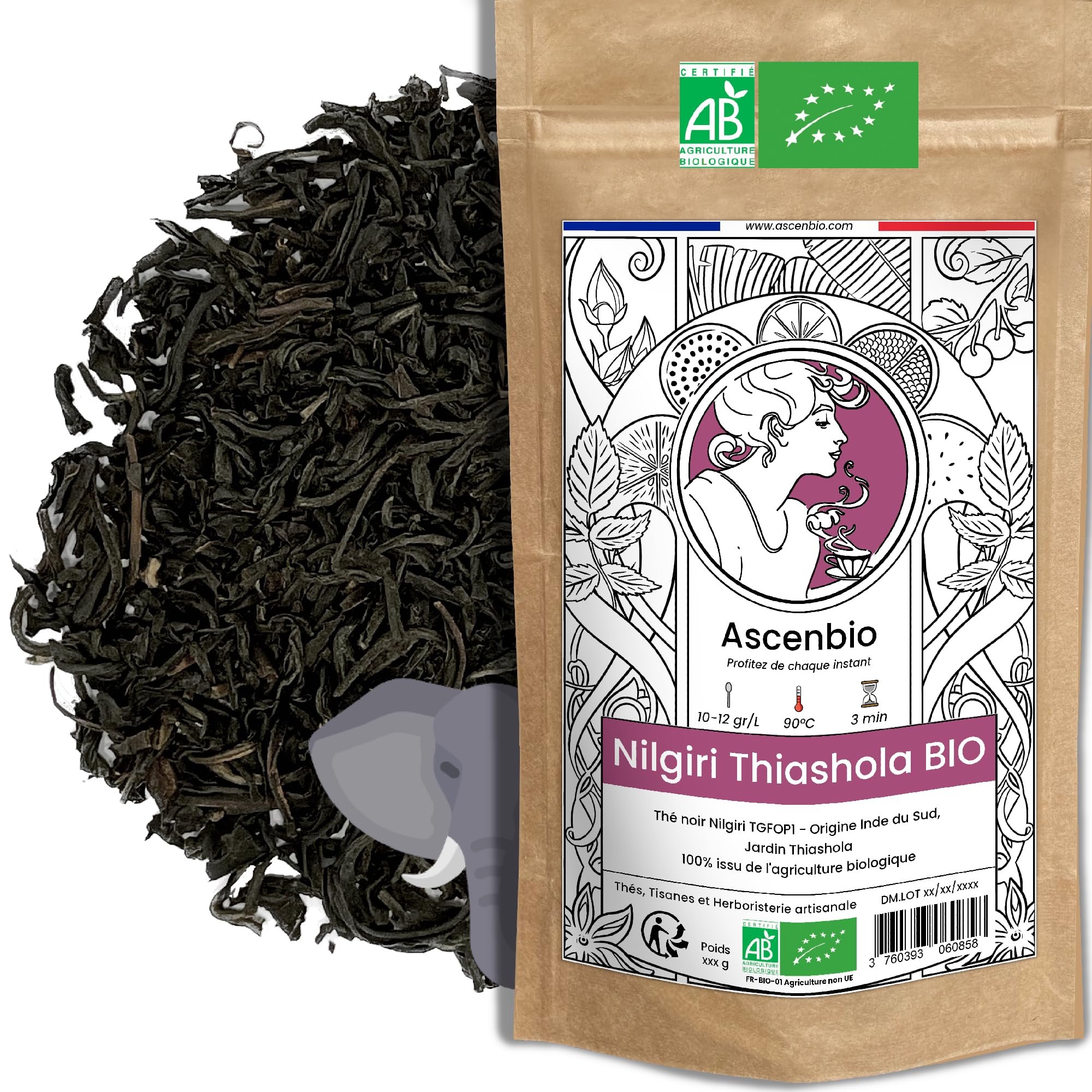 Ascenbio ? Thé Noir Nilgiri jardin Thiashola BIO, notes fruitées ? 180g vrac ? Préparé et conditionné en France ? Emballage biodégradable