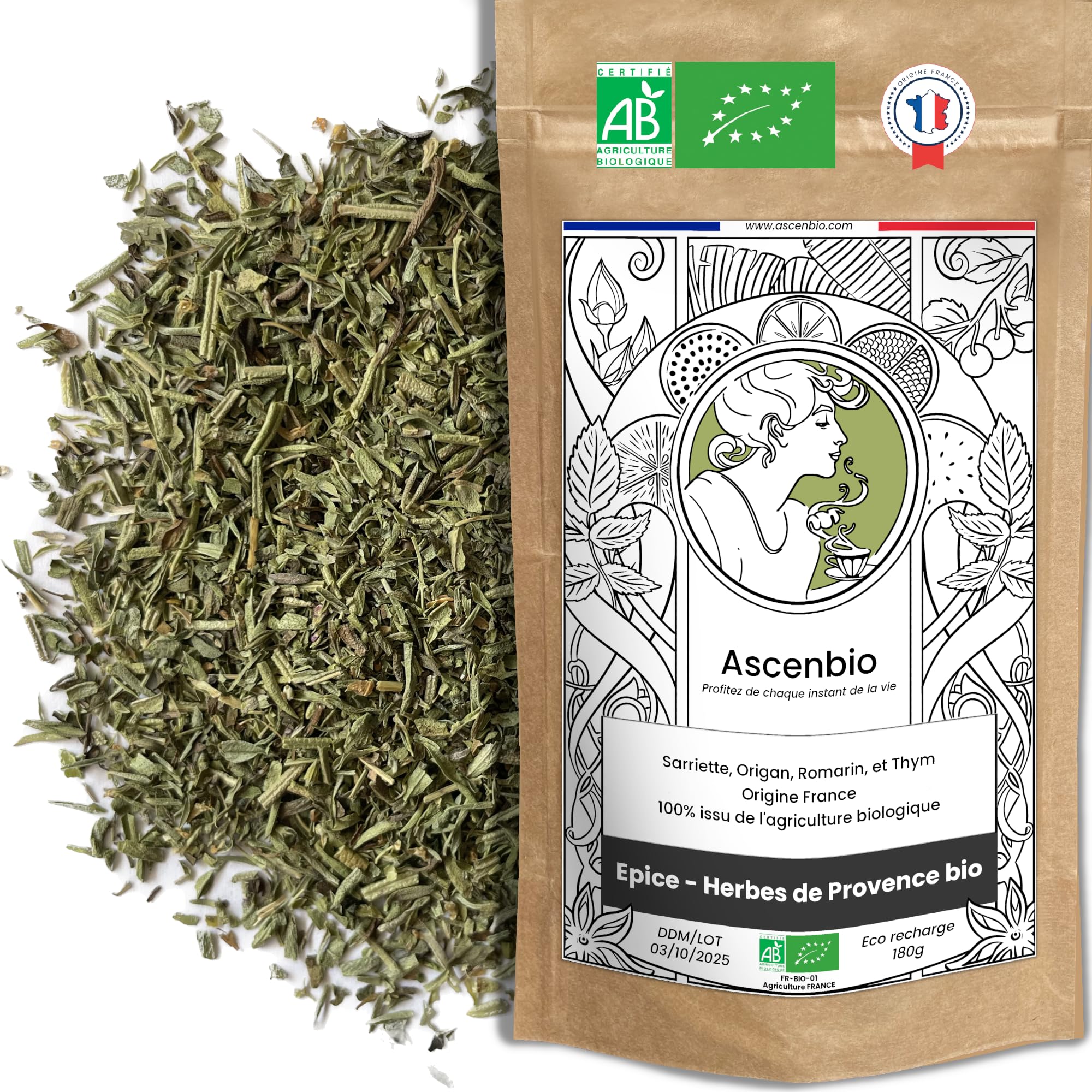 Ascenbio ? Herbes de Provence BIO ? Sud France PUR ? 180 g ? Préparé et conditionné en France ? Emballage biodégradable