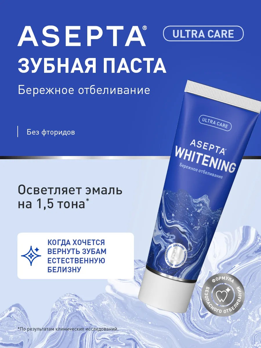 ASEPTA Whitening Fluoride-Free Whitening Toothpaste. Gentle whitening lightens the enamel of sensitive teeth by 1.5 shades in just 4 weeks, even at home. It contains only effective ingredients from trusted international manufacturers that boost oral immunity. Active ingredients: an enzymatic-mineral complex (papain, pyrophosphates, xylitol, zinc) and microgranules provide a multi-stage cleansing system: they break down plaque, dissolve the mineral matrix of dental plaque, and prevent the re-formation of plaque and tartar. This is especially important for smokers and coffee drinkers. Hydroxyapatite and potassium citrate have a remineralizing effect, which helps restore and strengthen the enamel crystal lattice and prevent cavities. Calamus and Eleutherococcus extracts accelerate mucosal regeneration. This white toothpaste has antibacterial and antiseptic properties, providing fresh breath. This remineralizing care product doesn't leave microcracks and is recommended for the whole family—both adults and teenagers aged 14 and over, as well as those with braces. Suitable for cleaning with a regular or electric toothbrush. Using this remineralizing cosmetic product can be an excellent addition to your daily care and hygiene routine after a professional whitening procedure at the dentist. Enjoy a natural glow and beautiful smile day after day without increased sensitivity! The ASEPTA brand offers cosmetics based on the latest advances in cosmetology and pharmacology.