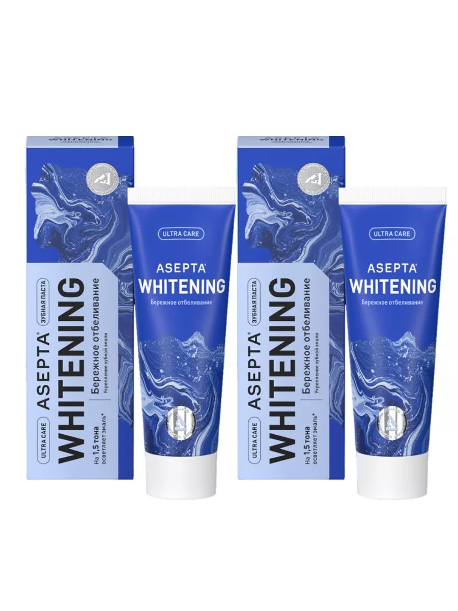 | Комплектация | 2 упаковки; зубная паста Асепта Plus, бережное отбеливание |