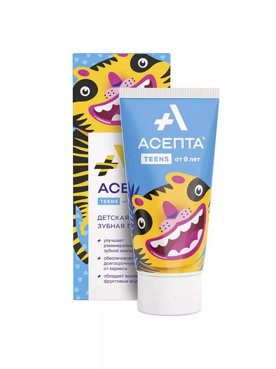 АСЕПТА TEENS ЗУБНАЯ ПАСТА ДЕТСКАЯ ОТ 8 ЛЕТ 50МЛ. Линия АСЕПТА TEENS 8+ - линия средств для ухода за полостью рта детей и подростков. Внешний вид и свойства: однородная гелевая масса желтого цвета с мятно фруктовым запахом, с насыщенным вкусом абрикоса, персика и сливок. Возрастная категория с 8 лет. Низкоабразивная зубная паста для бережного ухода за полостью рта детей и подростков-Эффективная комбинация «аминофторид + ксилит» способствует укреплению зубной эмали и повышает устойчивость зубной эмали к воздействию бактерий и кислот.-Комплекс растительных экстрактов поддерживает здоровье дёсен.-Мягкие абразивы дают возможность осуществлять тщательную гигиену полости рта, при этом не травмируя эмаль зубов.-Яркий вкус «персик-абрикос-сливки» делает чистку зубов приятной процедурой.Активные компоненты:-Олафлур (аминофторид) обеспечивает длительную защиту от воздействия кариесогенных бактерий и кислот, насыщает зубы кальцием и фосфором.-Ксилит усиливает реминерализацию зубов и препятствует образованию кариеса.-Экстракт алоэ увлажняет и стимулирует процесс регенерации клеток слизистой полости рта.-Экстракт календулы оказывает противомикробное и противовоспалительное действиеНанести небольшое количество пасты на зубную щётку.Чистить зубы 3 минуты не менее 2-х раз в день.Прополоскать рот водой.Подходит для ежедневного применения.