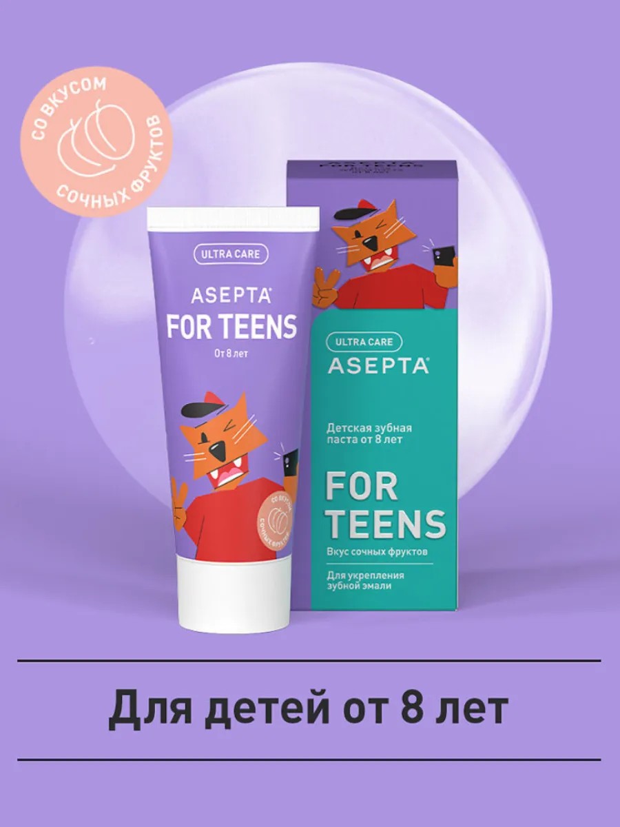 Детская зубная паста Asepta Teens от 8 лет - паста с фтором - оптимальный способ укрепить хрупкую эмаль зубов у детей и подростков и повысить её устойчивость к кариесу. В период смены молочных зубов на постоянные необходимо особое внимание уделить гигиене полости рта ребенка, ведь это основа его будущих здоровых зубов и дёсен. Бережный уход за дёснами о постоянными зубами детей и подростков Низкоабразивная зубная паста для бережного ухода за полостью рта детей и подростков Мягкие абразивы дают возможность осуществлять тщательную гигиену полости рта, при этом не травмируя эмаль зубов. Улучшает реминерализацию зубной эмали Обеспечивает долгосрочную защиту от кариеса Обладает ярким фруктовым вкусом коктейля из абрикоса, персика и сливок. Нанести небольшое количество пасты на зубную щётку. Чистить зубы 3 минуты не менее 2-х раз в день. Прополоскать рот водой. Подходит для ежедневного применения.