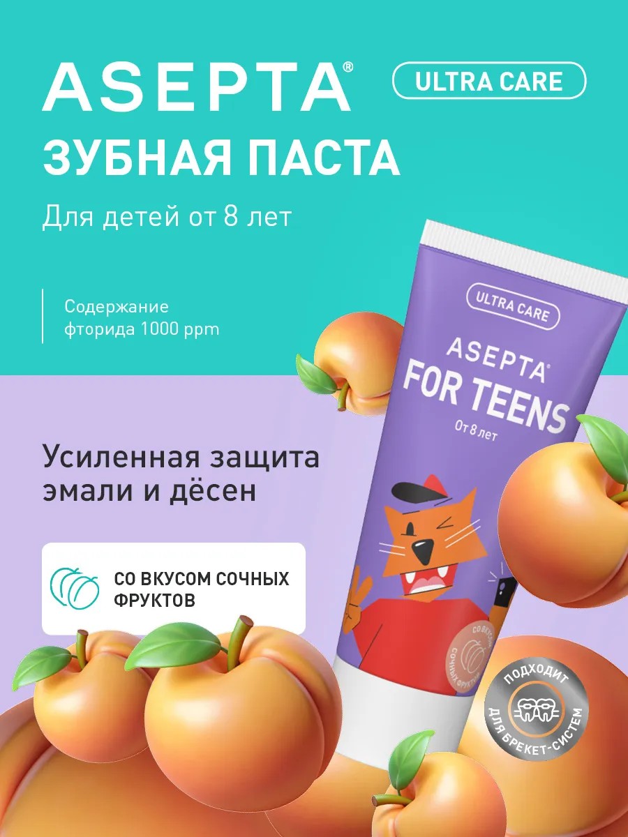 Детская реминерализирующая зубная паста ASEPTA For Teens с 8 лет предназначена для бережного очищения в период смены молочных зубов на постоянные. Благодаря абрикосовому и персиковому вкусу, ребенок с удовольствием будет делать утреннюю и вечернюю чистку. Профессиональное средство со фтором является оптимальным способом для укрепления и восстановления хрупкой эмали у детей и подростков. Эффективная комбинация фторгидроксиапатит + натрия монофторфосфат запускает процесс реминерализации в 2 этапа: 1: после чистки в слюне повышается концентрация реминерализующих компонентов и формируется защитная биопленка. 2: в течение дня она растворяется слюной, высвобождает гидроксиапатит, восстанавливающий поврежденные участки. Ксилит 10% способствует высокой защите от кариеса. Экстракт календулы и алоэ оказывают противомикробное и антибактериальное действие. Низкоабразивная паста препятствует образованию налета, помогает от воспаления десен и обеспечивает свежее дыхание. Правильная гигиена и ежедневный уход за полостью рта – основа будущих здоровых зубов. Можно использовать как с обычной щеткой, так и с электрической. Подходит для тех, кто носит брекеты. Бренд Асепта - это косметика, основанная на достижениях современной косметологии и фармакологии.