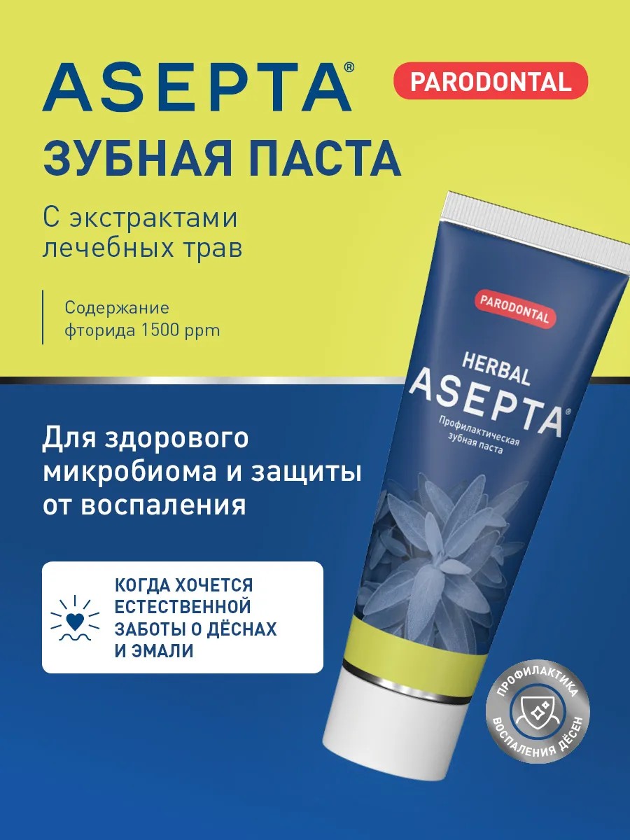 Профилактическая зубная паста «ASEPTA» с экстрактами лечебных трав и ферментативной системой расщепления зубного налета для многоступенчатого ухода за полостью рта, защиты дёсен и зубов.