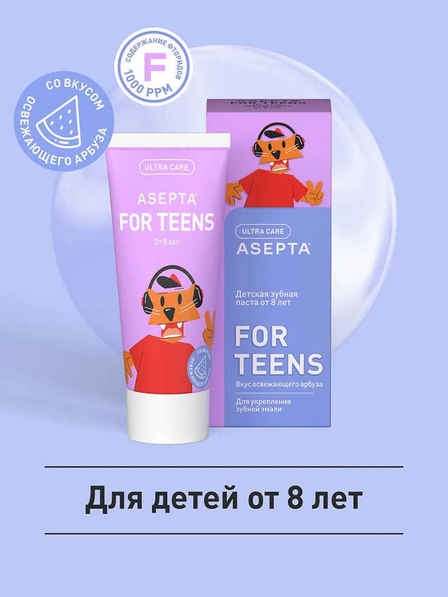 ASEPTA TEENS Минерализация – это зубная паста с ярким вкусом освежающего арбуза и комплексом активных компонентов для реминерализации хрупкой эмали у подростков и детей от 8 лет.