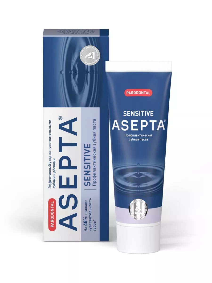 Лечебно-профилактическая зубная паста "Асепта Sensitive": снижает повышенную чувствительность зубов; укрепляет зубную эмаль и защищает зубы от кариеса; обладает антибактериальным действием; снимает воспаление и кровоточивость дёсен; удаляет зубной налёт и препятствует его дальнейшему образованию; освежает дыхание.