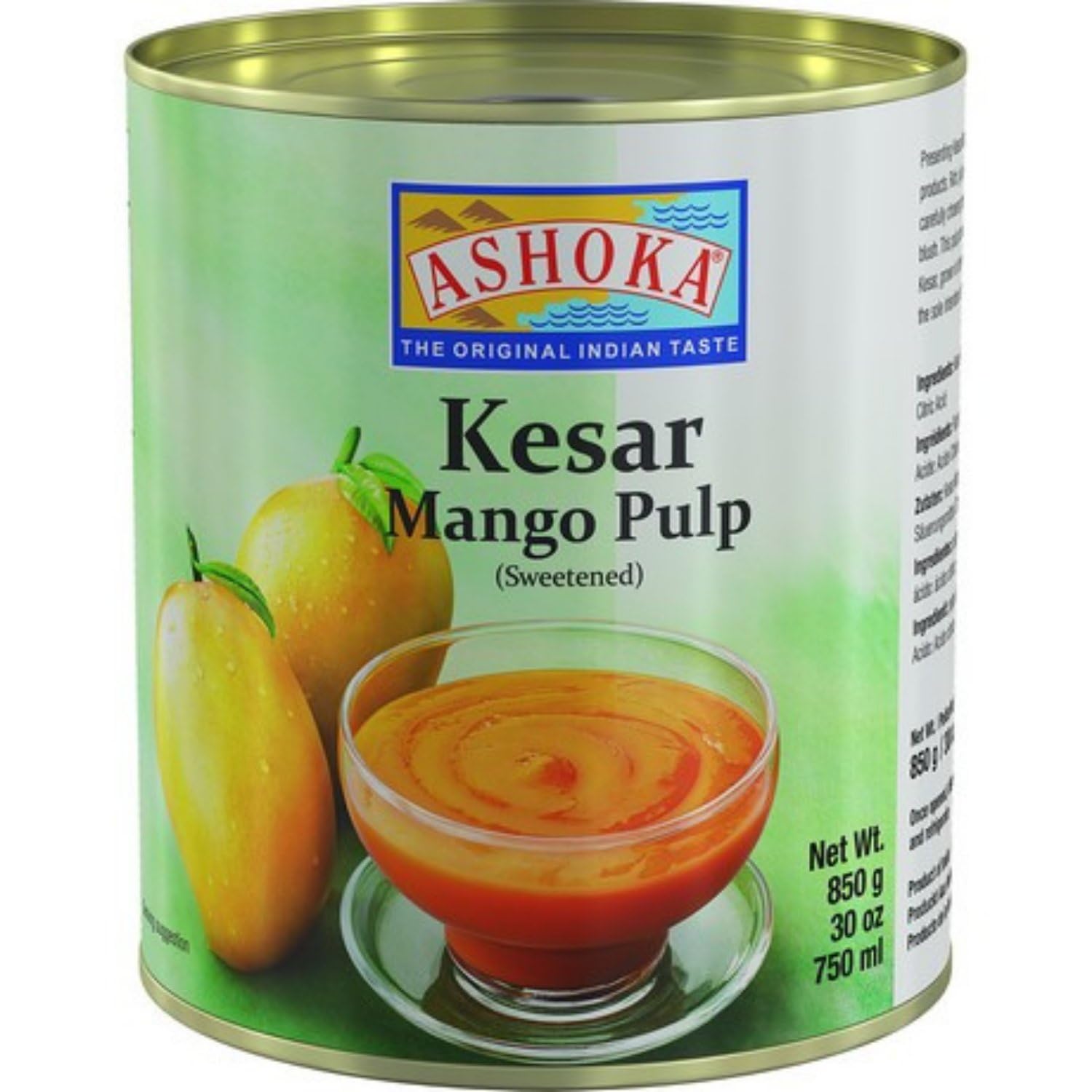 INGREDIENTS Ingredients: Kesar mango puree (94 ), sugar, oxygen: citric acid (E330) May contain traces of nuts.Ashoka Mangopuur Kesar, verpakking van 4 (4 x 850 g) INGREDIËNTEN Ingrediënten: Kesar mangopuree (94 ), suiker, zuurstof: citroenzuur (E330)Kan sporen van noten bevatten.