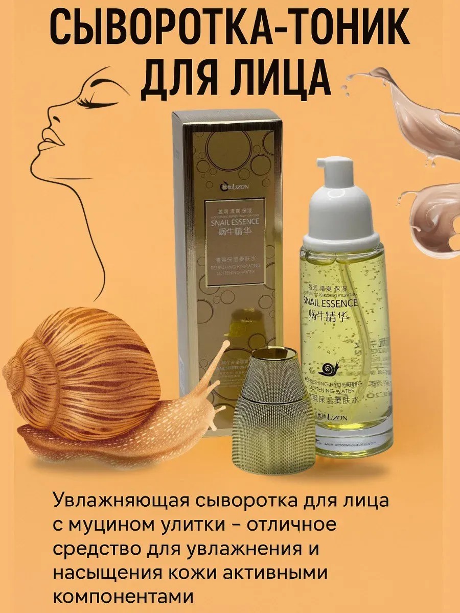 This snail mucin facial serum-tonic is a multifunctional product for deep hydration, nourishment, and skin restoration. The active formula with snail mucin saturates cells with moisture, promotes skin regeneration, smoothes wrinkles, and improves firmness and elasticity. This serum-tonic is suitable for daily facial care and helps reduce dryness, flaking, irritation, and signs of fatigue. It actively combats pigmentation, dullness, and uneven skin tone, restoring freshness and radiance. Suitable for all skin types: dry, oily, combination, and sensitive. Its light texture absorbs quickly, leaves no stickiness, and prepares the skin for further care. You may have been looking for: snail mucin facial serum, moisturizing facial toner, anti-wrinkle serum, snail facial toner, anti-aging serum, skin restoration toner, anti-wrinkle serum, skin nourishing serum, moisturizing facial toner, anti-aging care, snail mucin toner, skin moisturizer, rejuvenating facial serum.