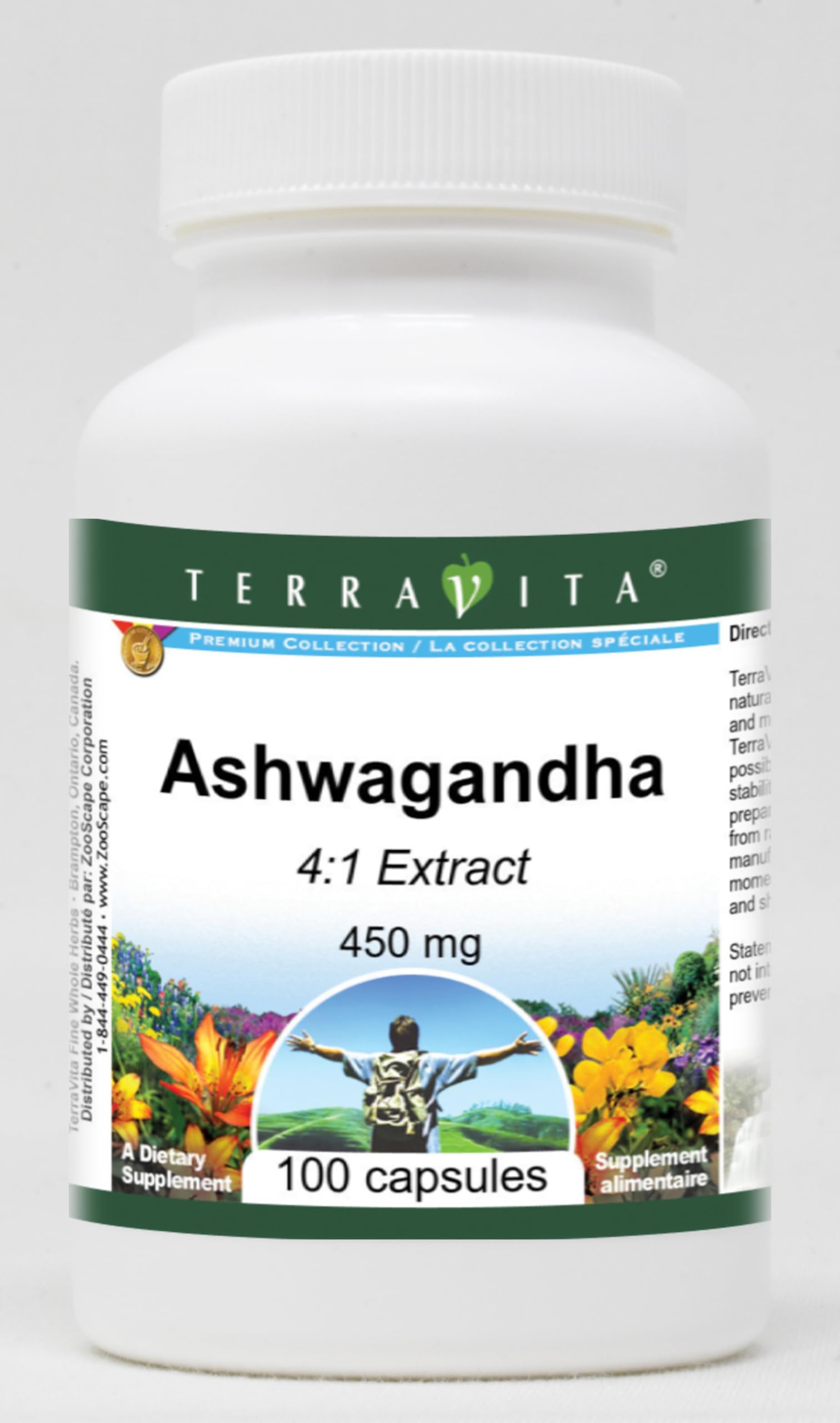 Ashwagandha 4:1 Extract - 450 mg (100 capsules, ZIN: 427749) Packaged in the United States in a cGMP certified facility (current Good Manufacturing Practice). No fillers. Manufacturer: TerraVita Size: 100 capsules Easy-to-swallow Capsules in a sealed bottle. Ingredients: Ashwagandha 4:1 Extract - 450 mg, Gelatin, Water