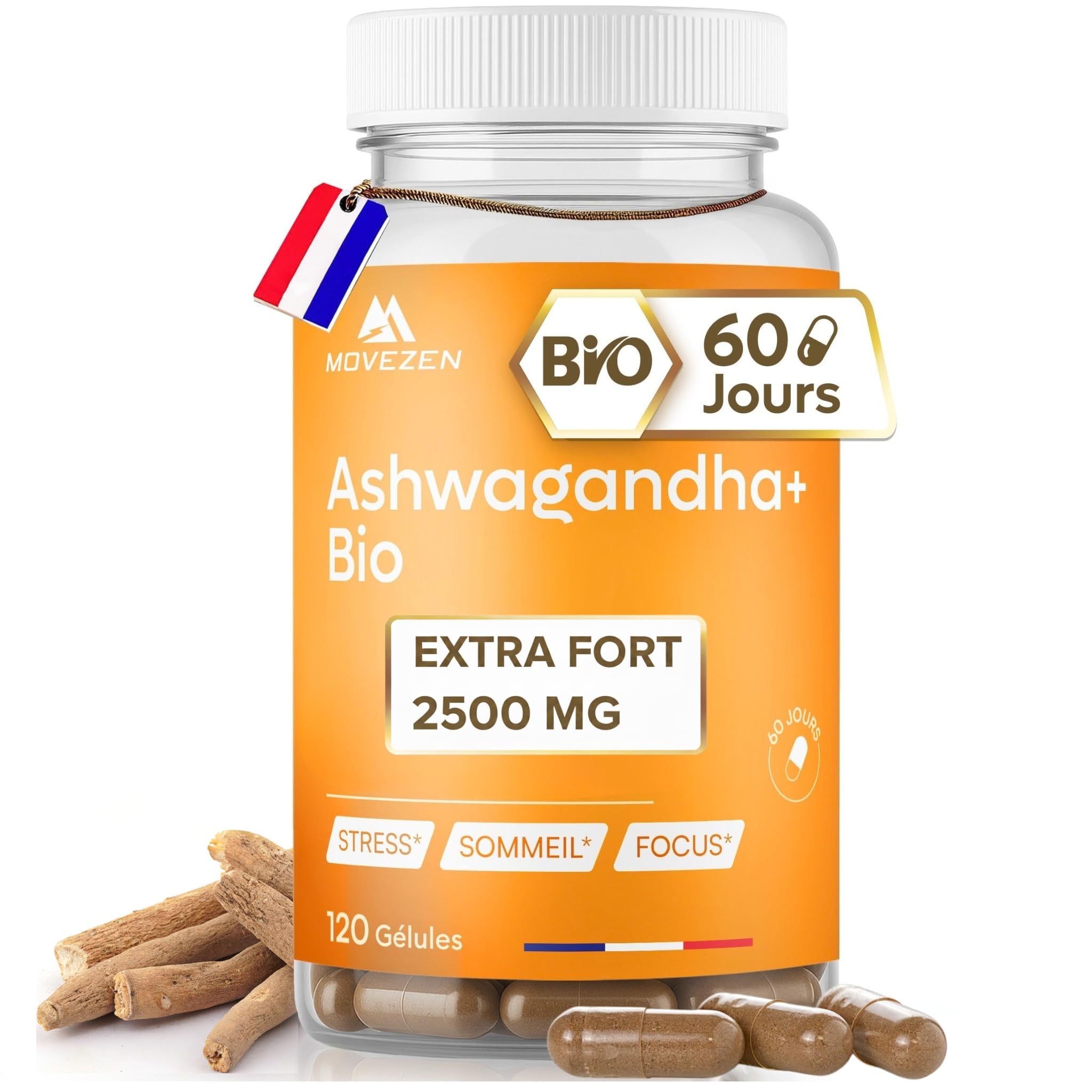 FRENCH EXPERTISE TRACEABILITY: MOVEZEN, a French company, combines Ayurvedic tradition with rigorous quality standards. Each batch is inspected and traced, guaranteeing a reliable and transparent food supplement. ? PREMIUM QUALITY RIGOROUS CONTROL: Registered with Compl'Alim and manufactured according to ISO 9001, GMP, and HACCP standards. Our vegan capsules, free of GMOs, gluten, and additives, are rigorously tested to guarantee purity and safety. SIMPLE ROUTINE OPTIMAL DURATION: 2 capsules per day are sufficient for a full 2 months. A convenient 120-capsule vegan format, designed to easily fit into your daily routine and support an active lifestyle. EVENING SLEEP RELAXATION: Thanks to its soothing properties, ashwagandha promotes relaxation before bedtime and supports better quality rest during the night. STABLE ENERGY MENTAL BALANCE: Ashwagandha, or "Indian ginseng," is valued for helping the body better cope with stress and supporting emotional balance, thus promoting a clearer mind and consistent energy. EXTRA STRENGTH ORGANIC ASHWAGANDHA: Concentrated 5:1 extract from certified organic ashwagandha roots. Each serving provides 2500 mg root equivalent, standardized in withanolides for optimal quality, to support relaxation and promote daily well-being.EXPERTISE FRANÇAISE TRAÇABILITÉ : MOVEZEN, société française, allie la tradition ayurvédique à des standards de qualité rigoureux. Chaque lot est contrôlé et tracé, garantissant un complément alimentaire fiable et transparent. ? QUALITÉ PREMIUM CONTRÔLE RIGOUREUX : Déclaré auprès de Compl'Alim et élaboré selon les normes ISO 9001, GMP et HACCP. Nos gélules végan, sans OGM, gluten ni additifs, sont rigoureusement testées pour garantir pureté et sécurité. ROUTINE SIMPLE DURÉE OPTIMALE : 2 gélules par jour suffisent pour 2 mois complets. Un format pratique de 120 gélules végan, pensé pour s'intégrer facilement à votre quotidien et accompagner un mode de vie actif. SOMMEIL RELAXATION DU SOIR : Grâce à ses vertus apaisantes, l'ashwagandha accompagne la détente avant le coucher et soutient une meilleure qualité de repos durant la nuit. ÉNERGIE STABLE ÉQUILIBRE MENTAL : L'ashwagandha, ou "ginseng indien", est appréciée pour aider l'organisme à mieux faire face au stress et à soutenir l'équilibre émotionnel, favorisant ainsi un esprit plus clair et une énergie régulière. ASHWAGANDHA BIO EXTRA FORT : Extrait 5:1 concentré issu de racines d'ashwagandha bio certifiées. Chaque portion apporte 2500 mg équivalent racine, standardisée en withanolides pour une qualité optimale, afin d'accompagner la détente et favoriser le bien-être au quotidien.Ashwagandha BIO MOVEZEN Extra Fort – 2500 mg Extrait 5:1 Concentré en Withanolides – Complément Alimentaire Relaxation, Sommeil Périodes de Stress – 120 Gélules Végan – Cure Bien-Être 2 Mois