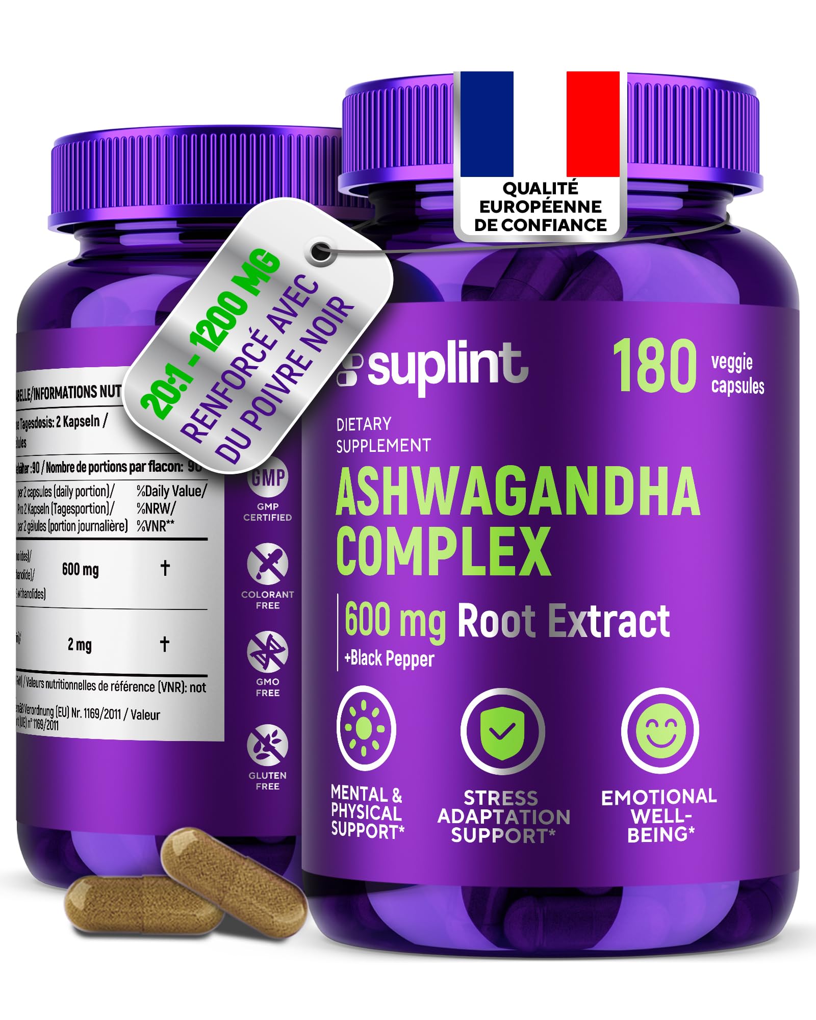 Not suitable for children under 12 years of age, pregnant or breastfeeding women. Consult a healthcare professional before use if you are taking medication or have a medical condition. Do not exceed the recommended daily dose.Ne convient pas aux enfants de moins de 12 ans, aux femmes enceintes ou allaitantes. Consultez un professionnel de la santé avant utilisation si vous prenez des médicaments ou si vous souffrez d'une affection médicale. Ne pas dépasser la dose journalière recommandée.Ashwagandha en gélules – 600 mg d'extrait de racine avec 5 de withanolides – haute concentration – 180 gélules véganes – testé en laboratoire, certifié GMP, cure de 3 mois (1 Pack)