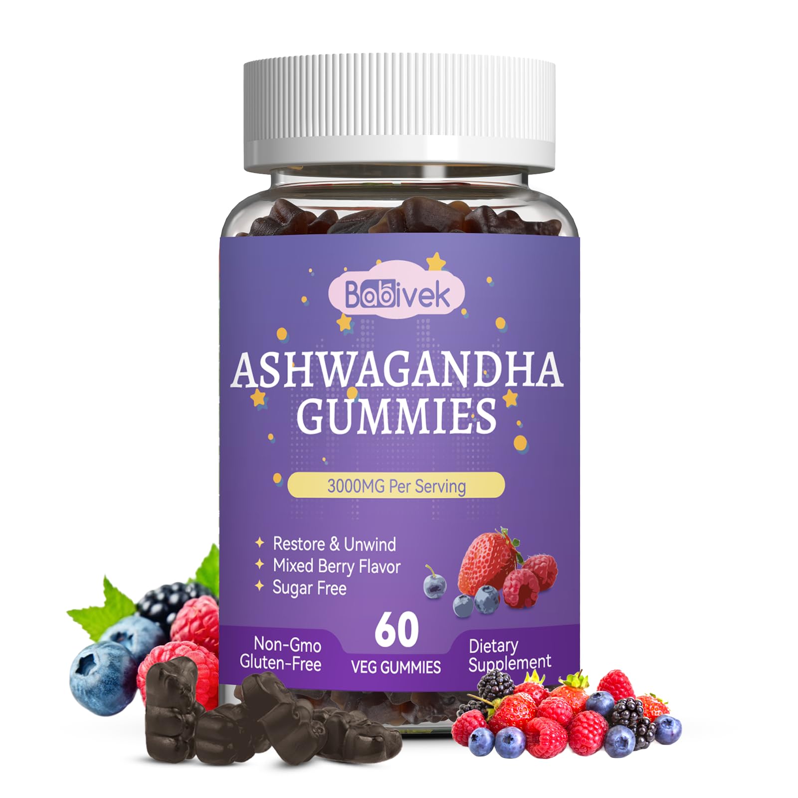 Commitment to Purity, Quality, and Your Satisfaction: We are committed to your health. Our Ashwagandha Gummies are manufactured in a facility that adheres to strict quality control standards. We use premium ingredients to ensure a pure and effective supplement. Your satisfaction is our priority, and we stand behind the quality of our product. Delicious Mixed Berry Flavor Convenient Daily Routine: Say goodbye to hard-to-swallow pills. Our soft, chewy gummies feature a tangy and sweet Mixed Berry flavor that makes taking your daily supplements a treat. The simple "2-gummies-a-day" routine and convenient 60-count bottle provide a full month's supply, making it easy to maintain your wellness goals at home or on the go. Comprehensive Wellness Support with Superfood Nutrients: Our gummies go beyond relaxation. We've included Maca for natural energy and vitality, Turmeric Extract with Black Pepper for enhanced absorption, plus essential vitamins and minerals like Vitamin C, D3, B12, and Magnesium to comprehensively support your immune system, energy production, and overall well-being. Enhanced with GABA L-Theanine for Deep, Restorative Relaxation: Formulated with GABA (Gamma-Aminobutyric Acid) and L-Theanine to synergistically support your nervous system. This powerful combination helps quiet a racing mind, encourage mental relaxation, so you wake up feeling refreshed and rejuvenated. Potent 3000mg Ashwagandha for Stress Relief Cortisol Balance: Experience the adaptogenic power of a high-potency 3000mg Ashwagandha extract per serving. This key ingredient is traditionally used to help the body cope with stress, promote a sense of calm, and support balanced cortisol levels, helping you navigate daily pressures with greater ease.