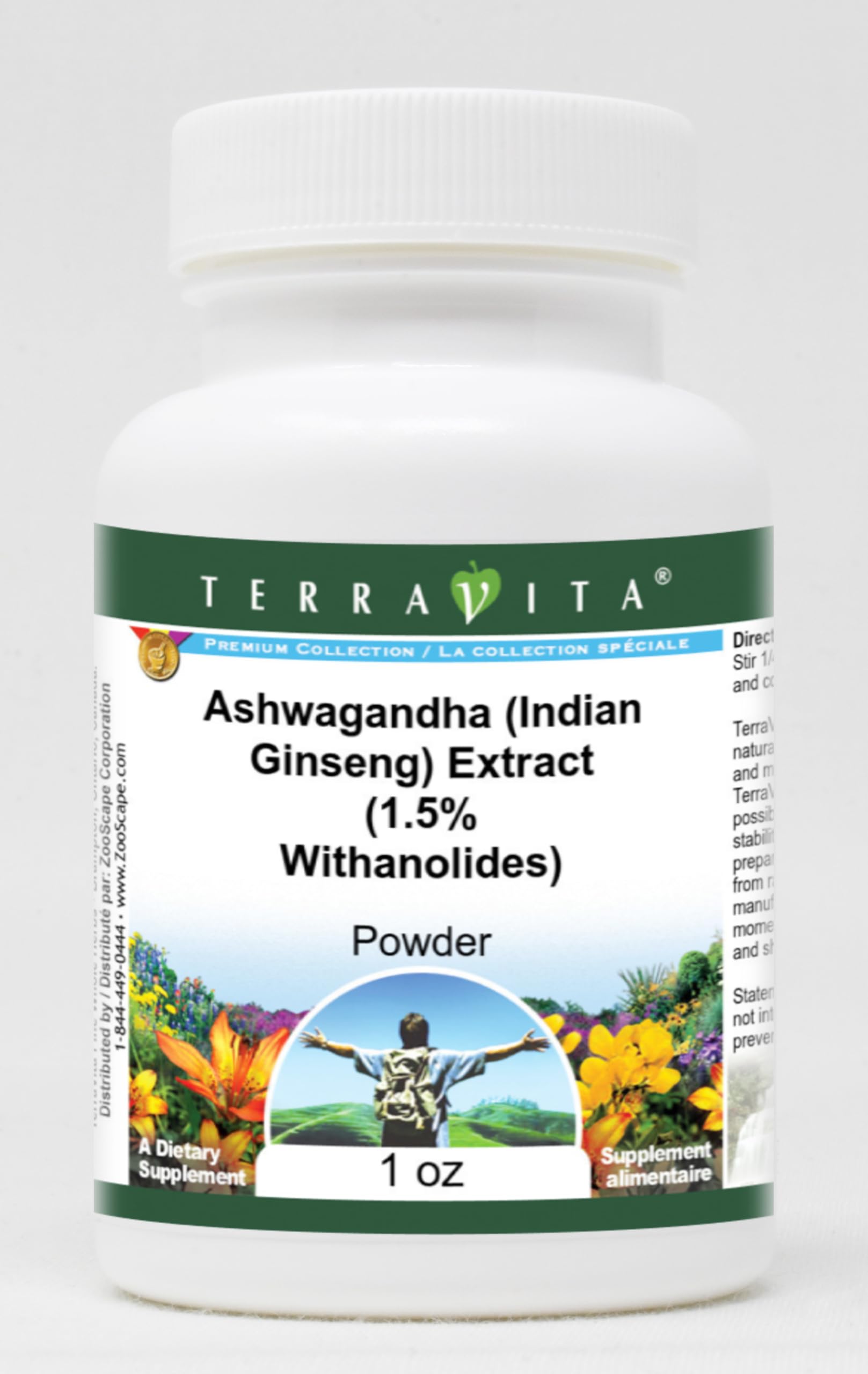 Convenient Powder format. Size: 1 oz. Manufacturer: TerraVita. No fillers. Ashwagandha (Indian Ginseng) Extract (1.5 Withanolides) Powder (1 oz, ZIN: 514065).