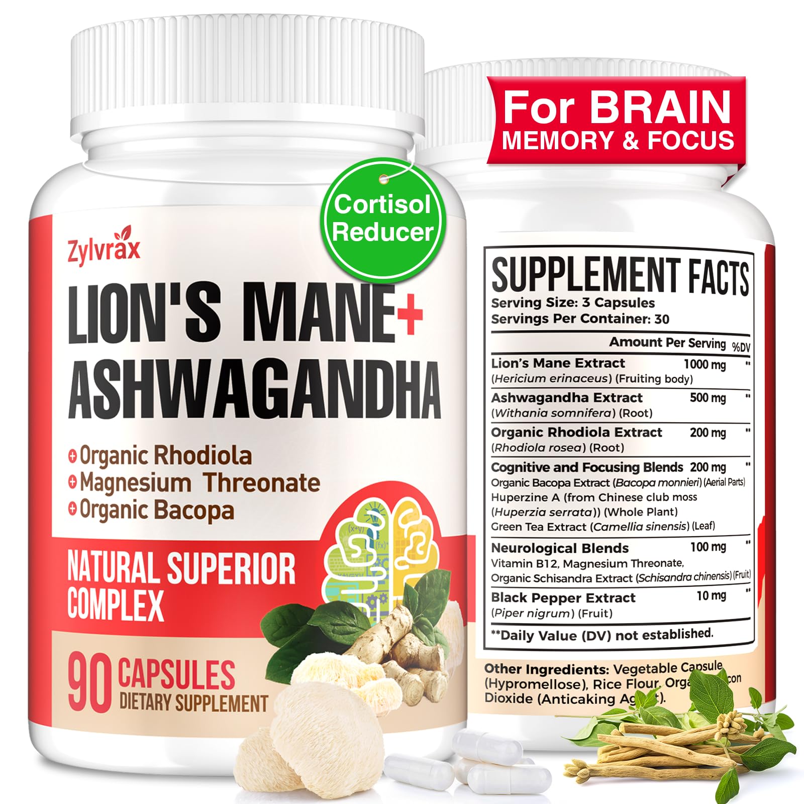 Ashwagandha & Lions Mane Supplements Capsules Brain Supplements for Memory and Focus Ashwagandha with Rhodiola Rosea for Cognitive Immune Support Cortisol Supplements for Women 90 Capsules 90 Count (Pack of 1)