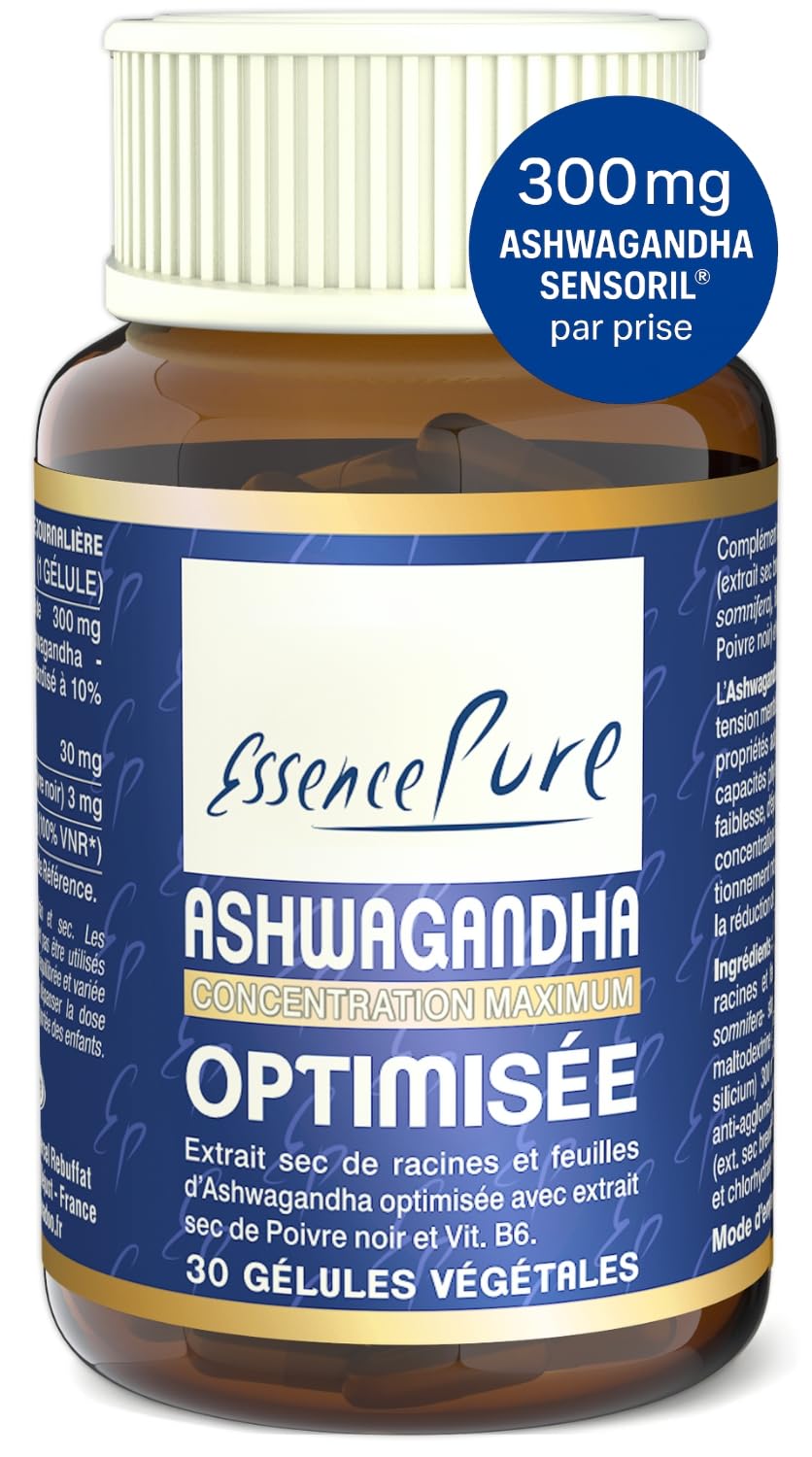 A COMMITMENT THAT FEELS IN EVERY DETAIL: Made by Api-Nature, a phytotherapy specialist with 50 years of combined expertise. 100 pure ingredients, tested in independent laboratories and produced in our own GMP and HACCP certified facilities. This isn't just another supplement. This is Pure Essence. A SIMPLE RITUAL FOR BIG CHANGE: Just one vegetarian capsule a day is all it takes. Allergen-free, hassle-free. Presented in a recyclable amber glass bottle, perfect for any routine aimed at less anxiety and more mental clarity. Easy to take. Impossible to forget. ? A FORMULA THAT SPEAKS YOUR BODY'S LANGUAGE: We've added Bioperine (patented black pepper) to boost absorption, as well as vitamin B6, recognized by the EFSA for its essential role in the proper functioning of the nervous system. Because what matters isn't what you take, but what your body absorbs. CONCRETE RESULTS, VALIDATED BY SCIENCE: No blends. No fillers. Just Sensoril: the most concentrated and clinically studied Ashwagandha extract. Each softgel delivers 30 mg of withanolides, extracted with water—cleaner, more potent, more effective—under rigorous control. FIND MIND-BODY BALANCE: There are ashwagandhas… and then there's Sensoril, the only extract from both the root and leaves to offer a full spectrum of actives. With 10 withanolides and 32 oligosaccharides, this formula doesn't just calm stress: it reprograms it from within, with a potency and bioavailability that others can't match.UNE EXIGENCE QUI SE RESSENT DANS CHAQUE DÉTAIL : Fabriqué par Api-Nature, spécialiste en phytothérapie avec 50 ans d'expertise cumulée. Ingrédients 100 purs, testés en laboratoires indépendants et produits dans nos propres installations certifiées GMP et HACCP. Ce n'est pas un complément de plus. C'est Essence Pure. UN RITUEL SIMPLE POUR DE GRANDS CHANGEMENTS : 1 seule gélule végétale par jour suffit. Sans allergènes, sans tracas. Présenté dans un flacon en verre ambré recyclable, parfait pour toute routine visant moins d'anxiété et plus de clarté mentale. Facile à prendre. Impossible à oublier. ? UNE FORMULE QUI PARLE LE LANGAGE DE VOTRE CORPS : Nous avons ajouté Bioperine (poivre noir breveté) pour booster l'absorption, ainsi que de la vitamine B6, reconnue par l'EFSA pour son rôle essentiel dans le bon fonctionnement du système nerveux. Parce que ce qui compte, ce n'est pas ce que vous prenez, mais ce que votre corps assimile. DES RÉSULTATS CONCRETS, VALIDÉS PAR LA SCIENCE : Pas de mélanges. Pas de remplissage. Juste Sensoril : l'extrait d'Ashwagandha le plus concentré et cliniquement étudié. Chaque gélule fournit 30 mg de withanolides, extraits à l'eau — plus propre, plus puissant, plus efficace — sous un contrôle rigoureux. RETROUVEZ L'ÉQUILIBRE CORPS-ESPRIT : Il y a des ashwagandhas… et puis il y a Sensoril, le seul extrait issu à la fois de la racine et des feuilles pour offrir un spectre complet d'actifs. Avec 10 de withanolides et 32 d'oligosaccharides, cette formule ne fait pas que calmer le stress : elle le reprogramme de l'intérieur, avec une puissance et une biodisponibilité que les autres n'atteignent pas.Ashwagandha Sensoril 300mg, 10 Withanolides, 2x Plus Fort Que KSM-66 - Détox Cortisol Anti Stress Adulte Vitamine B6, Vegan Sans OGM, 30 Gélules 1 Mois, Api-Nature