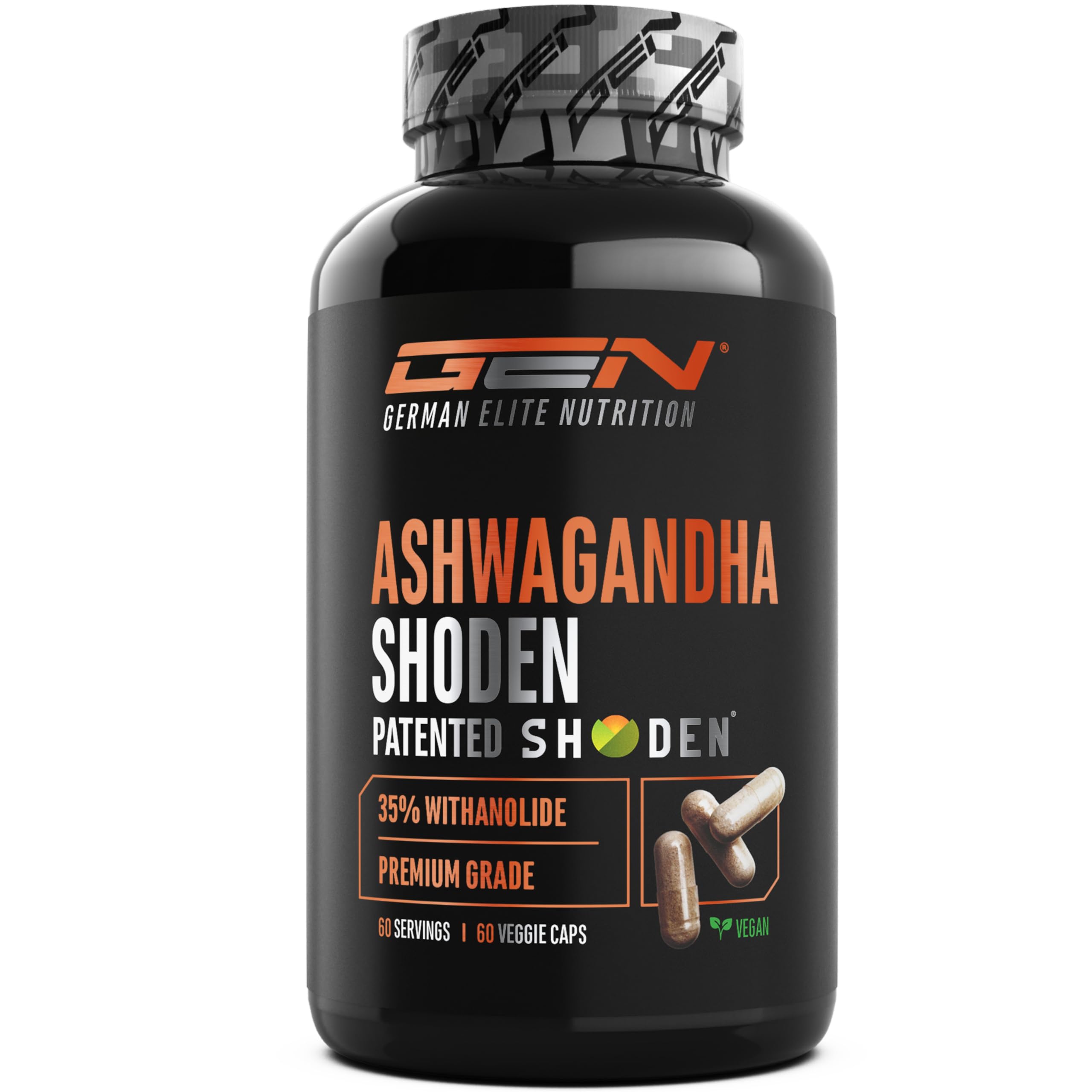 BY ATHLETES, FOR ATHLETES: Since 2016, German Elite Nutrition has been producing high-quality nutritional supplements bearing the "German Quality" seal. Our products are made from selected raw materials according to strict quality standards, with a particular focus on reliability and purity. VEGAN AND FREE FROM UNWANTED ADDITIVES: Our ashwagandha capsules are completely vegan and contain no undesirable additives: no magnesium stearate, flavorings, colorings, stabilizers, gelatin, preservatives, lactose, gluten, or GMOs. USAGE AND SPAN: Just one capsule a day is enough to cover the recommended daily intake of high-quality Shoden Ashwagandha extract. Ideal to take in the evening before bed or after training. The convenient 60-capsule pack provides a 60-day supply. PATENTED RAW MATERIAL: High-quality ashwagandha (Withania somnifera) root extract with patented Shoden raw material. The trademarked extract offers documented quality and a concentrated 10:1 extraction ratio: 10 parts fresh ashwagandha root are used to obtain 1 part of highly concentrated extract. This results in a particularly pure product rich in active ingredients. HIGHEST QUALITY STANDARD: Each capsule contains 300 mg of Shoden's patented ashwagandha extract with 35 withanolide glycosides (105 mg per capsule). In comparison, many standard ashwagandha products are standardized to only 5 or 10 withanolides. Shoden offers a significantly higher concentration and quality.