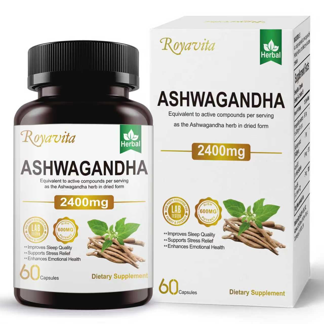 THE ROYAVITA PROMISE – Our formula is 100 vegan, and free from dairy, soy, and gluten ingredients—made to fit every lifestyle. Every batch is third-party tested for purity, quality, and safety. At Royavita, we're all about clean, effective supplements you can trust to support your health goals—day in and day out. SIMPLIFY YOUR LIFE – Royavita Ashwagandha capsules are made to fit right into your routine. Just two easy-to-take capsules a day help you stay calm, focused, and energized. Whether you're on the go, traveling, or juggling a busy schedule, our formula is designed to keep up with you—so you can get the benefits of Ashwagandha anytime, anywhere. MULTI-COMPONENT SYNERGY EFFECT – The powerful formula is carefully crafted with black pepper extract to significantly boost nutrient absorption, ensuring your body receives the full benefits of every dose—faster and more effectively. We've also included organic vitamins B6 and B12, essential for maintaining steady energy levels, promoting optimal brain health, and enhancing mental clarity. Stay sharp, focused, and energized from morning to night with this all-in-one wellness solution. THE BENEFITS OF ROYAVITA ASHWAGANDHA – A natural adaptogen that promotes sustained energy, enhanced focus, and mental clarity. Our Ashwagandha capsules help maintain optimal cognitive function and vitality throughout the day, supporting your active lifestyle and overall well-being. HIGH-POTENCY ASHWAGANDHA 2400MG – Experience the power of nature with Royavita Ashwagandha 2400mg – a potent, plant-based adaptogen designed to help reduce stress and boost overall energy and vitality. Formulated with black pepper extract for enhanced absorption and organic vitamins B6 B12 for mental clarity and sustained energy.