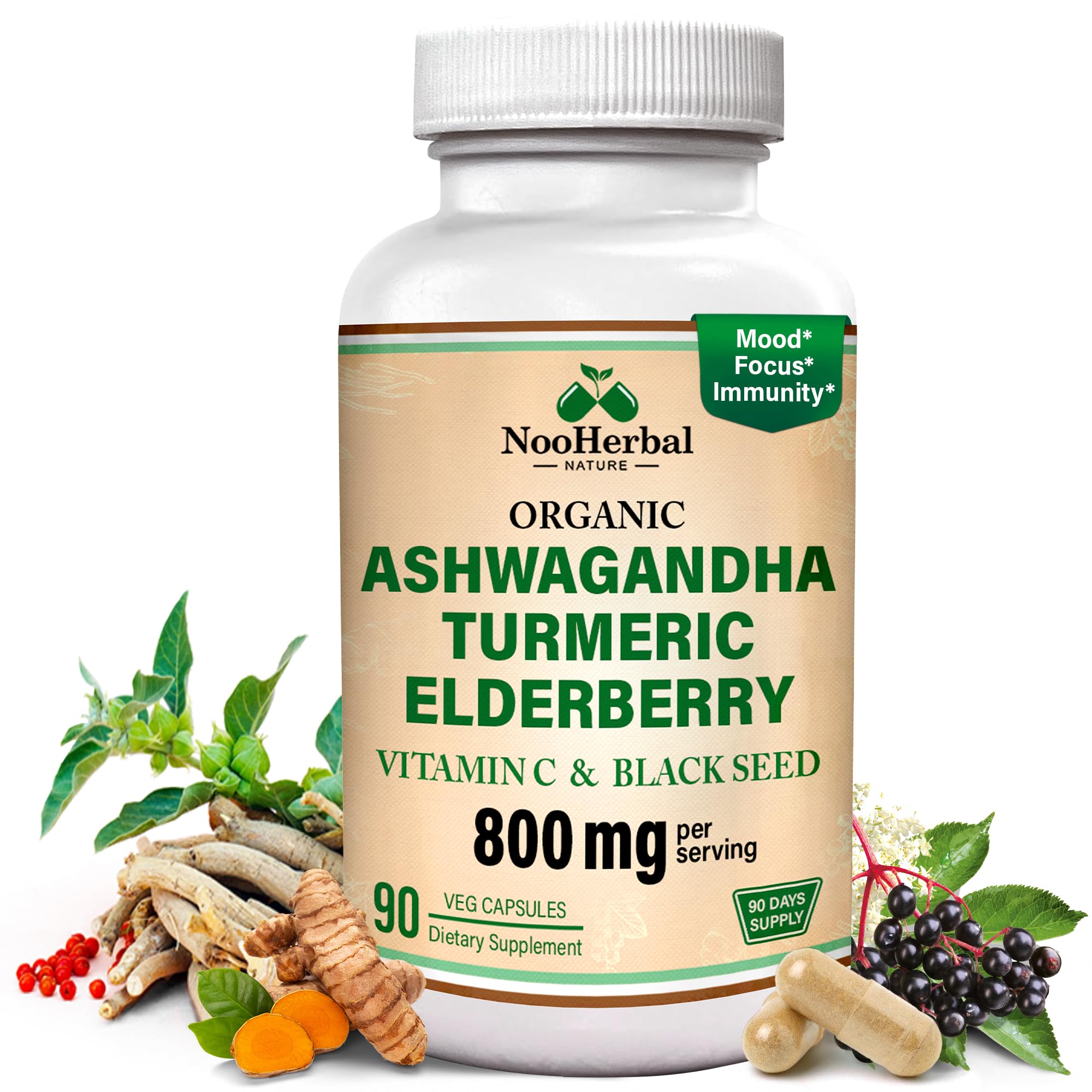 Ashwagandha Supplements with Turmeric Curcumin, Elderberry, Vitamin C & Black Seed - Supports Relaxation, Mood & Immune Health - 800mg - 90 Vegan Capsules, Non-GMO & Gluten-Free