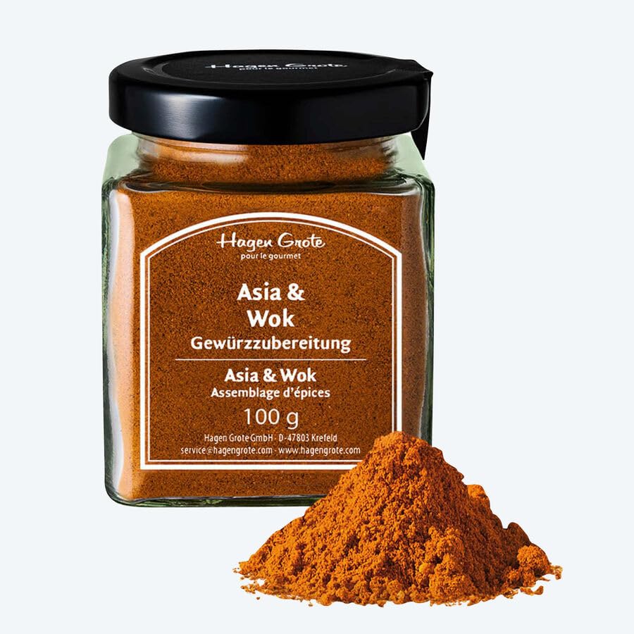 - Harmonious and slightly spicy blend of spices - Complex earthy aromas combined with fresh notes of ginger and coriander - For all Asian dishes Hagen Grote selects its spices from all over the world, according to strict criteria, such as natural cultivation. Our spice specialists perfectly match delicate ingredients to create blends that are strong in spicing power and rich in flavor. The slightly spicy mixture gives all Far Eastern dishes a surprising exotic touch. The combination of nutmeg, fenugreek and fennel, along with fresh ginger, coriander, chili pepper and Sichuan pepper gives the complex taste typical of East Asian cuisine. Also for a touch of the Far East in salad dressings, dips and marinades. ½ teaspoon is enough for 300 g of vegetables. All-natural ingredients, no flavor enhancers or preservatives. Spice jar: 8 cm high, 6.2 cm wide, 6.2 cm deep (with lid) Exclusive Hagen Grote Ingredients : bell pepper, chili peppers, coriander, garlic, ginger, dextrose, salt, fenugreek seed, fennel, star anise, nutmeg, cinnamon, Sichuan pepper, turmeric, basil. Instructions for use: Store away from light. Responsible for marketing: Hagen Grote GmbH, Grüner Dyk 36, D-47803 Krefeld Gourmet Asia Wok Spice Blend, 100 gFor all Asian dishes. Complex earthy aromas combined with fresh notes of ginger and coriander. Harmonious and slightly spicy spice blend. - Mélange d'épices harmonieux et légèrement piquant - Arômes complexes de terre combinés à des notes fraîches de gingembre et de coriandre - Pour tous les plats asiatiques Hagen Grote sélectionne dans le monde entier ses épices, selon des critères stricts, comme la culture naturelle. Nos spécialistes en épices assortissent parfaitement les ingrédients délicats pour créer des mélanges forts en pouvoir épiçant et riches en saveurs. Le mélange légèrement piquant donne à tous les plats d'Extrême-Orient une touche exotique étonnante. L'association de la muscade, du fenugrec et du fenouil, ainsi que du gingembre frais, de la coriandre, du piment piquant et du poivre du Sichuan donne le goût complexe typique de la cuisine d'Asie de l'Est. Également pour une touche d'Extrême-Orient dans les vinaigrettes, les dips et les marinades. ½ cuillère à café suffit pour 300 g de légumes. Ingrédients entièrement naturels, sans exhausteurs de goût ni conservateurs. Pot à épices : 8 cm de haut, 6,2 cm de large, 6,2 cm de profondeur (avec couvercle) Exclusif Hagen Grote Ingrédients : poivron, piments, coriandre, ail, gingembre, dextrose, sel, graine de fenugrec, fenouil, anis étoilé, noix de muscade, cannelle, poivre du Sichuan, curcuma, basilic. Consignes d'utilisation : Conserver à l'abri de la lumière. Responsable de la mise sur le marché : Hagen Grote GmbH, Grüner Dyk 36, D-47803 Krefeld Assemblage d'épices Gourmet Asia Wok, 100 gPour tous les plats asiatiques. Arômes complexes de terre combinés à des notes fraîches de gingembre et de coriandre. Mélange d'épices harmonieux et légèrement piquant.