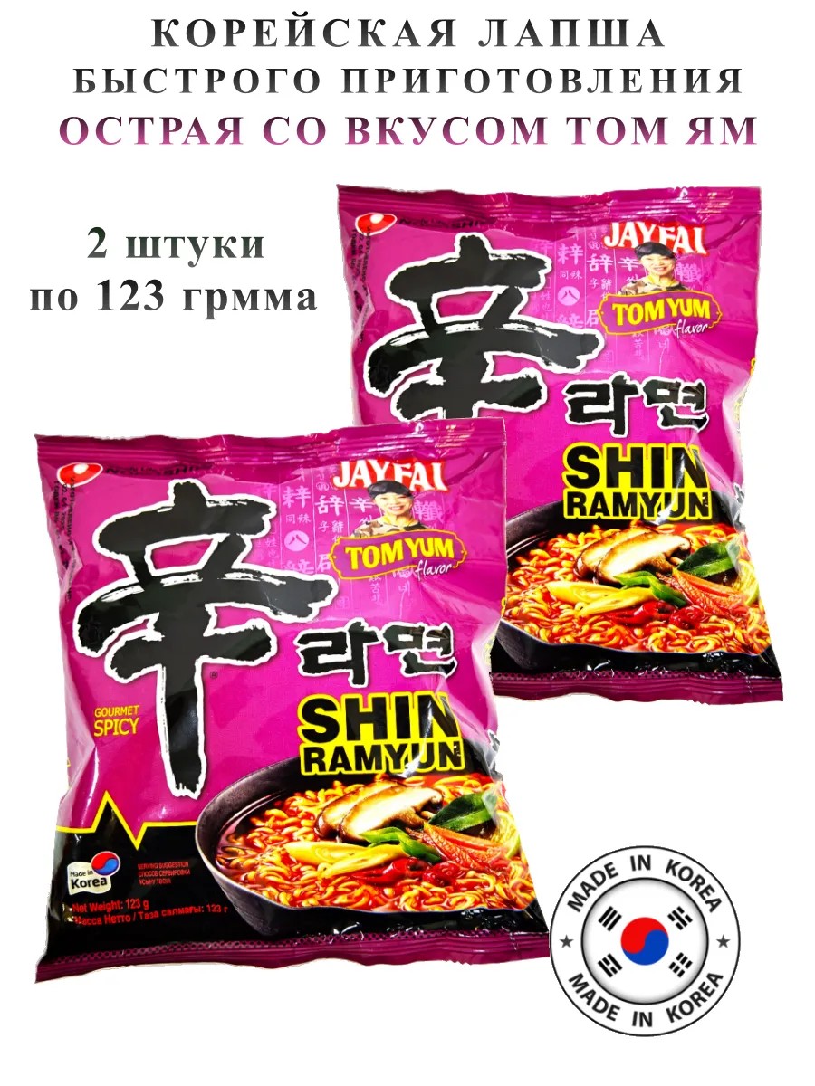 Лапша быстрого приготовления Шин Рамен острая со вкусом Том Ям. Лапша Shin Ramyun Tom Yum приятно порадует ценителей азиатской лапши с высокой степенью остроты. Если вы обожаете мегаострые блюда, то это то, что вам нужно. Лапша Шин Рамен – самый знаменитый продукт корейского бренда Nongshim. Она считается одной из наиболее вкусных. В упаковке находится порция лапши, пакетик с бульоном-приправой, пакетик с пастой Том Ям и пакетик с сублимированными топпингами (рыбные тефтели, капуста бок-чой и грибы). Регулировать уровень остроты можно количеством соуса. Истинные любители острой еды могут добавить всё содержимое пакетика полностью.