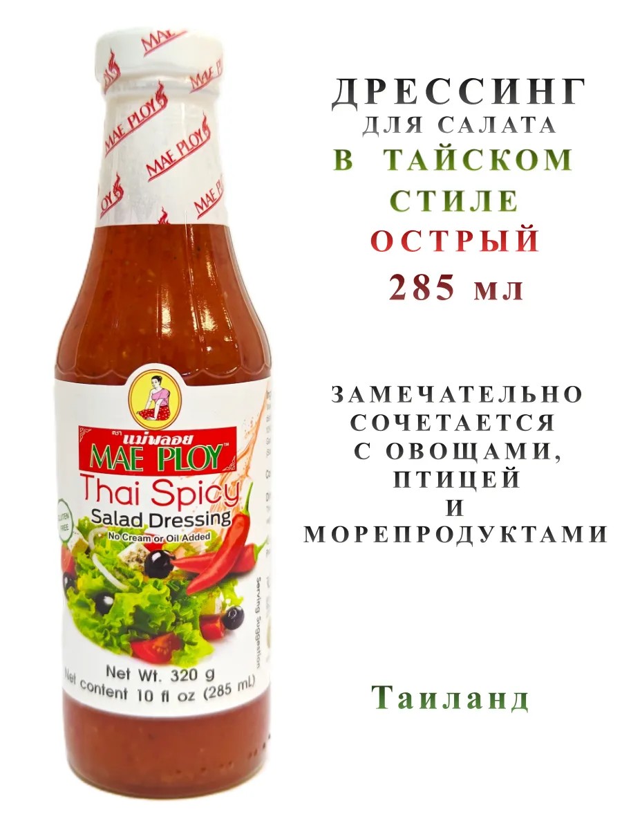 Яркая заправка для Ваших любимых салатов. Придает интересный вкус и незабываемый азиатский колорит. Острый дрессинг для салата в тайком стиле Mae Ploy увеличивает срок хранения готовых блюд, восполняет нехватку антиоксидантов в рационе.