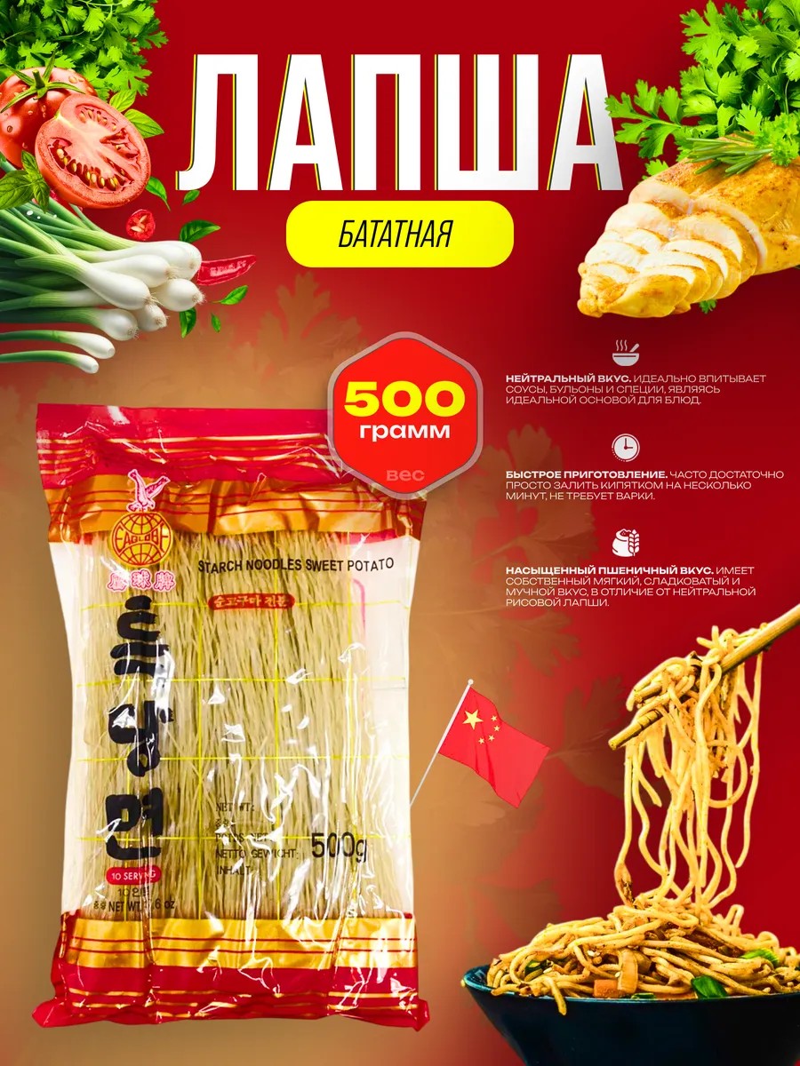 Вермишель бренда Eaglobe из сладкого картофеля (или батата) - аппетитное, вкусное, сытное, экзотическое блюдо. Ее особенность заключается во внешнем виде. Тонкая, прозрачная, практически "стеклянная" вермишель будет красиво смотреться на тарелке. Она имеет высокую питательную ценность и богата витаминами и минеральными веществами, содержит антоцианы, рекомендуется в качестве здорового питания, оказывает положительное влияние на легкие, уменьшает риски возникновения рака, язвы, сердечно-сосудистых заболеваний. Прекрасно сочетается с морепродуктами, мясом, птицей и т.д.