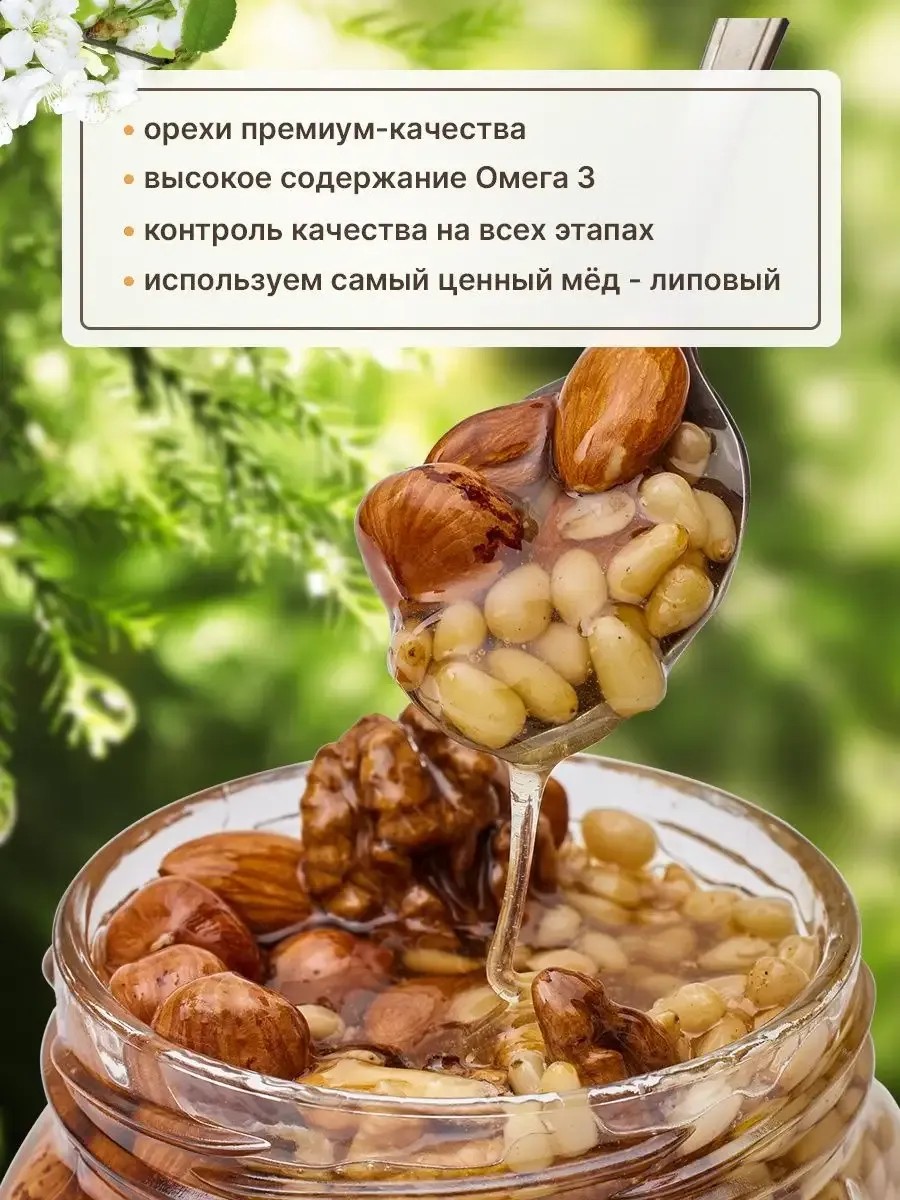 Assorted honey with nuts (pine nuts, hazelnuts, walnuts, almonds). Contains 100% natural linden honey from our own apiaries and premium nuts. Nuts in honey are a sugar-free treat—just what you need for those who follow a healthy diet. In the heart of Chuvashia, we collect linden honey and make a healthy treat—honey with nuts. Linden honey is the most beneficial and has healing properties. The aroma is fragrant. The color is golden. The taste is especially sweet with a slight bitterness that disappears in the aftertaste. Try Chuvash honey with selected nuts. The quality of our honey is confirmed by the necessary documents of product conformity. You can also buy a variety of natural products in the Chuvash Honey store. From the apiary to your table!