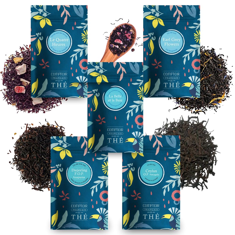 ? [SATISFACTION GUARANTEED] Teas with unparalleled flavors, with a total satisfaction guarantee. [IDEAL GIFT] Perfect for discovering or introducing someone to exceptional teas, this assortment is an ideal gift for tea lovers. [AROMATIC VARIETY] Natural and flavored black teas, with notes ranging from floral to indulgent, to suit all tastes. [SUPERIOR QUALITY] Teas carefully selected to offer refined and authentic flavors, perfect for black tea enthusiasts. [EXCEPTIONAL BLACK TEAS] Assortment of 5 Comptoir Français du Thé tea bags – 5 x 20g including Ceylon Pettiagalla, Darjeeling Anapurna, Earl Grey Flowers, La Belle et la Baie, and Quatre Heures.? [SATISFACTION GARANTIE] Des thés aux saveurs inégalées, avec une garantie de satisfaction totale. [IDÉAL À OFFRIR] Parfait pour découvrir ou faire découvrir des thés d'exception, cet assortiment est un cadeau idéal pour les amateurs de thé. [VARIÉTÉ AROMATIQUE] Des thés noirs natures et aromatisés, avec des notes allant de florales à gourmandes pour tous les goûts. [QUALITÉ SUPÉRIEURE] Thés sélectionnés avec soin pour offrir des saveurs raffinées et authentiques, parfaits pour les amateurs de thés noirs. [THÉS NOIRS EXCEPTIONNELS] Assortiment de 5 sachets Comptoir Français du Thé – 5 x 20g incluant Ceylan Pettiagalla, Darjeeling Anapurna, Earl Grey Flowers, La Belle et la Baie, Quatre Heures.Assortiment de Thés Noirs COMPTOIR FRANÇAIS DU THÉ 5 sachets refermables de 20g de Thés vrac pour varier les plaisirs tout au long de la journée