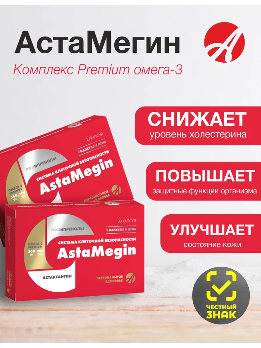 За счет объединения в составе трех мощных компонентов: Омега 3 PREMIUM 360 mg EPA/240 mg DHA, полипренолов и астаксантина, «АстаМегин» обладает синергетическим эффектом, усиливая действия компонентов от их совместного применения.