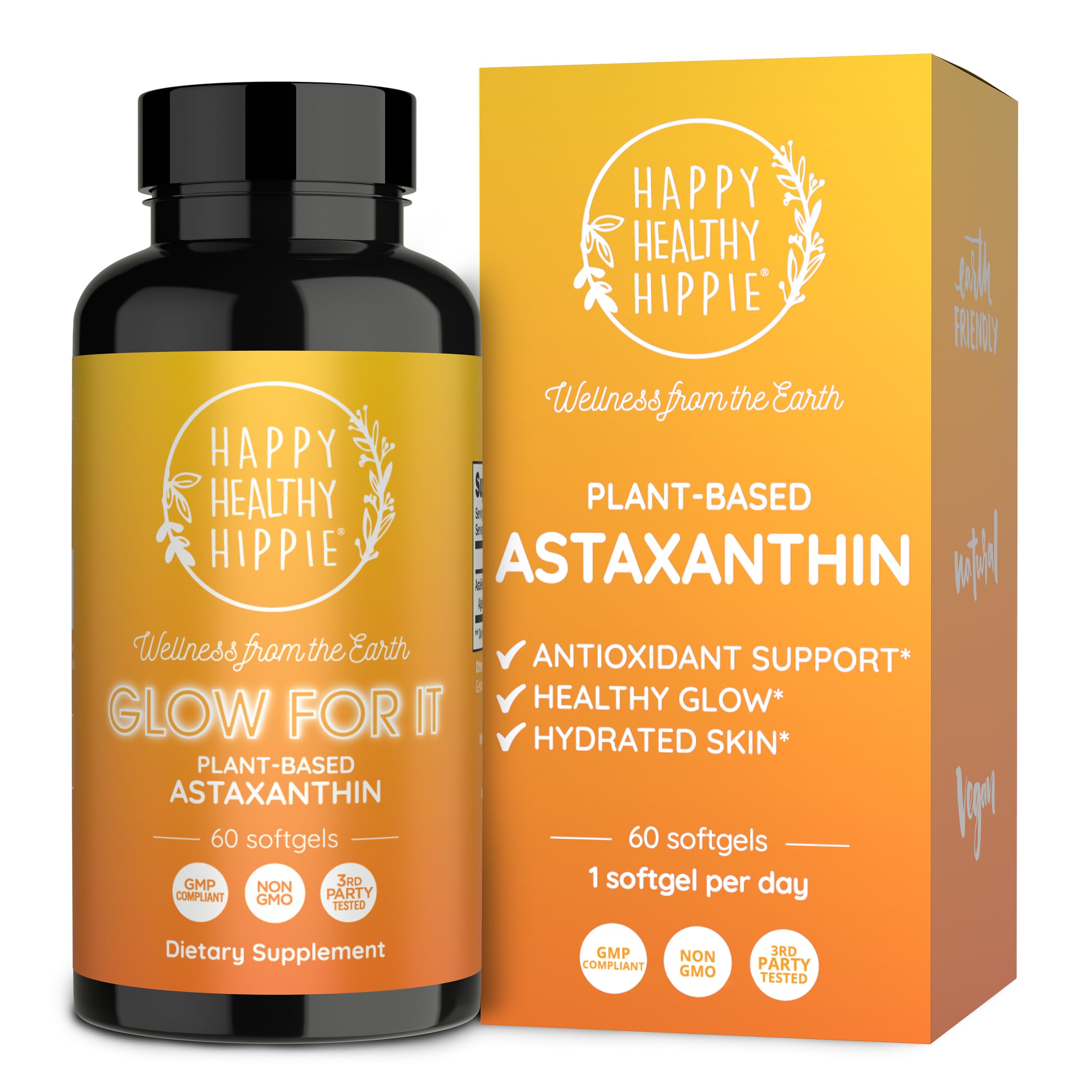 [The Happy Healthy Hippie Promise] Feel confident in your choice. Our Astaxanthin is Vegan, Non-GMO, and Third-Party Tested for purity and potency. It is mindfully made in the USA in a GMP-compliant facility. [Noticeable Results Over Time] With consistent daily use, you can expect to see improvements in skin hydration and eye comfort in as little as 4-6 weeks, with continued benefits for a lasting, natural glow. [Optimal Absorption] This formula is delivered in a softgel with sunflower seed oil to ensure the fat-soluble Astaxanthin is absorbed effectively, so you get the maximum benefit from every dose. [Clean, Plant-Based Formula] Get a clinically informed 12mg dose from a pure and sustainable source. Our Astaxanthin is derived from Haematococcus pluvialis microalgae, not synthetic additives. [Enhances Endurance Recovery] Support your active lifestyle. Research shows that Astaxanthin may help enhance endurance and promote recovery by reducing markers of exercise-related oxidative stress. [Helps Minimize Digital Eye Strain] Give your eyes a break from screen fatigue. Astaxanthin is shown to improve eye comfort and focus, helping protect against oxidative damage caused by daily use of digital devices. [Combats Visible Signs of Aging] By protecting your skin's natural vitality, this formula helps reduce the appearance of fine lines and wrinkles, supporting a smoother and more resilient complexion over time. [Powerful Cellular Antioxidant] As one of nature's strongest antioxidants, Astaxanthin helps neutralize free radicals to protect cells from oxidative stress and support your overall wellness from within. [Deep Hydration Support] Promotes smoother, more hydrated skin from the inside out. This natural antioxidant helps your skin maintain its defense against environmental stressors like sun and dryness. [Astaxanthin (12mg) - For a Radiant, Healthy Glow] Our plant-based formula helps maintain skin moisture, smoothness, and elasticity for a vibrant, youthful appearance. Clinical studies on Astaxanthin support its role in promoting skin health.