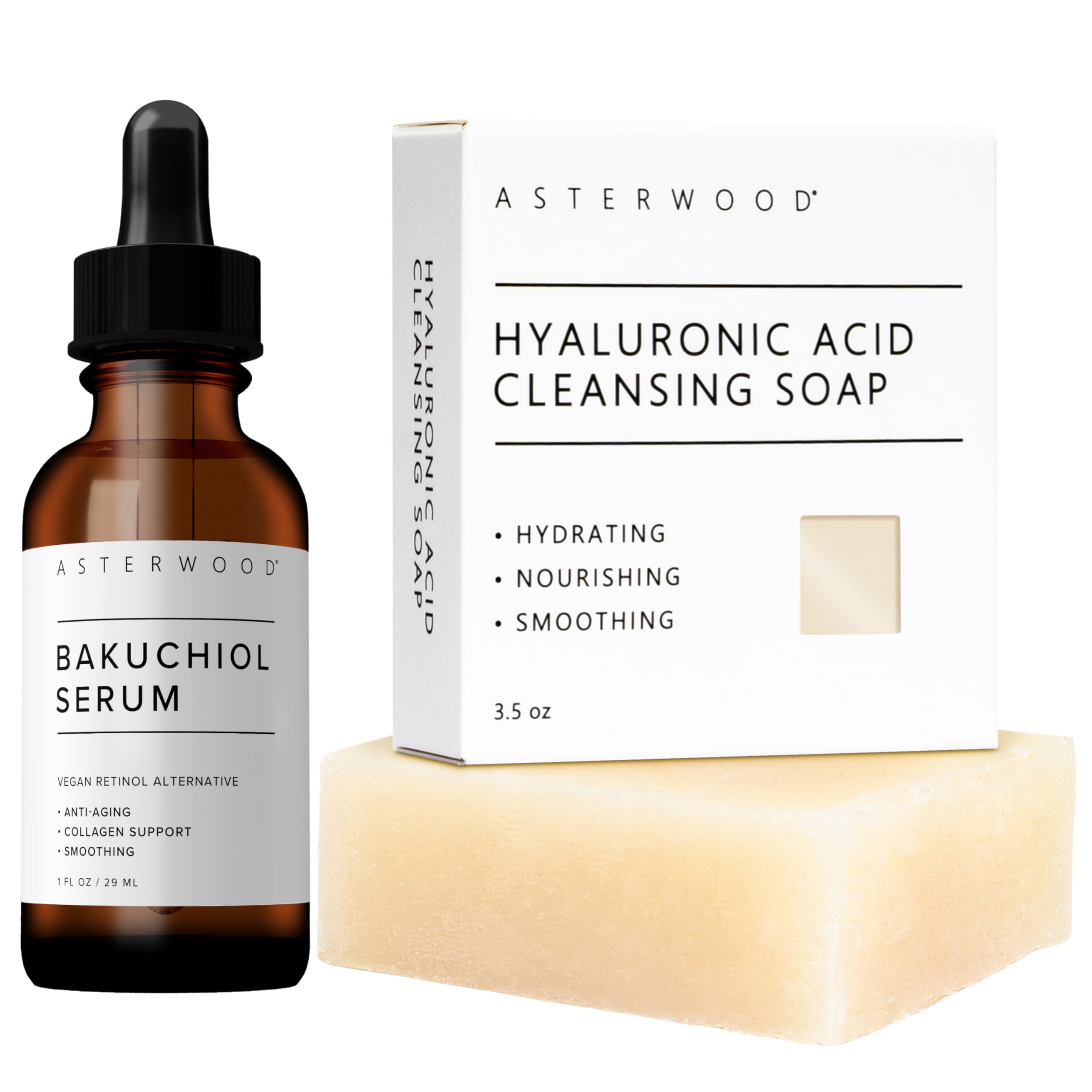 Asterwood Bakuchiol Serum 1 oz + Hyaluronic Acid Cleansing Face Soap 3.5 oz