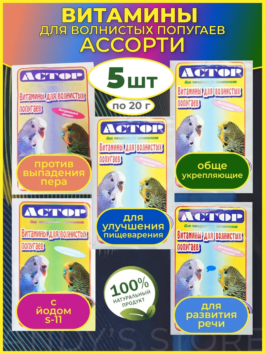 Предлагаем вам ассорти из 5 различных витаминов для волнистых попугаев Астор : общеукрепляющие, для улучшения пищеварения, против выпадения пера, для развития речи, с йодом. Каждый пакетик по 20 г.