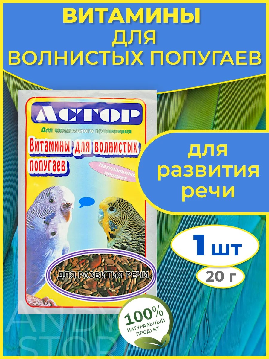 Витамины для волнистых попугаев АСТОР для развития речи. Эти витамины для птиц содержат полезные биологические вещества, необходимые для здоровья попугайчиков.