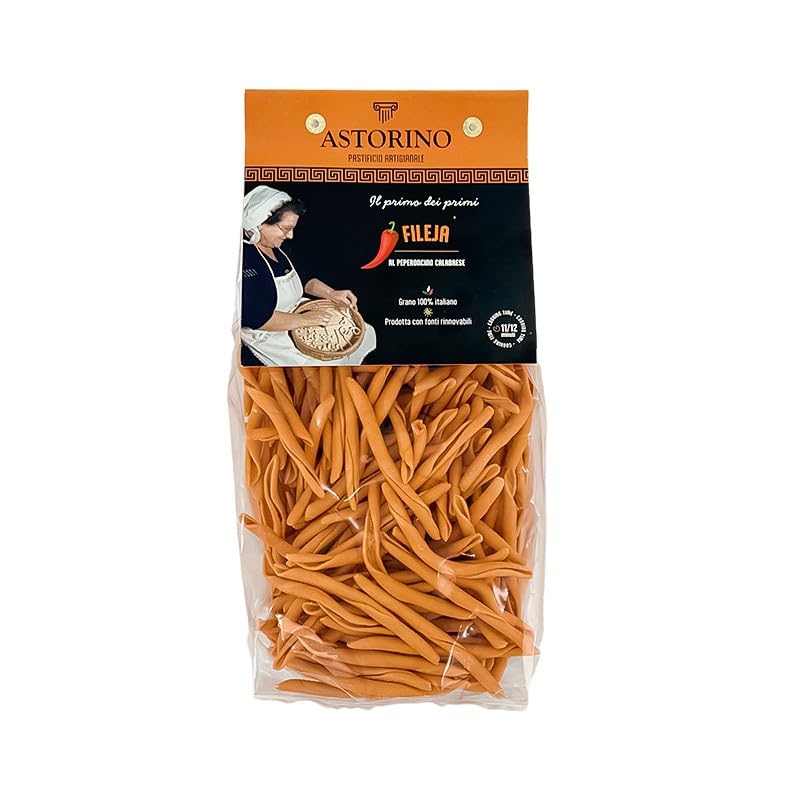 Fileja with Calabrian chili pepper, also known as filej, is a pasta form originating from the province of Vibo Valentia. Typical of the Calabria region, they represent artisanal pasta made according to age-old traditions. INGREDIENTS Durum wheat semolina, Calabrian chili pepper, water.Fileja met Calabrische Chilipeper Fileja met Calabrische chilipeper, ook wel bekend als filej, is een pastavorm afkomstig uit de provincie Vibo Valentia. Typisch voor de regio Calabrië, vertegenwoordigen ze ambachtelijke pasta die wordt gemaakt volgens eeuwenoude tradities. INGREDIËNTEN Griesmeel van harde tarwe, Calabrische chilipeper, water.