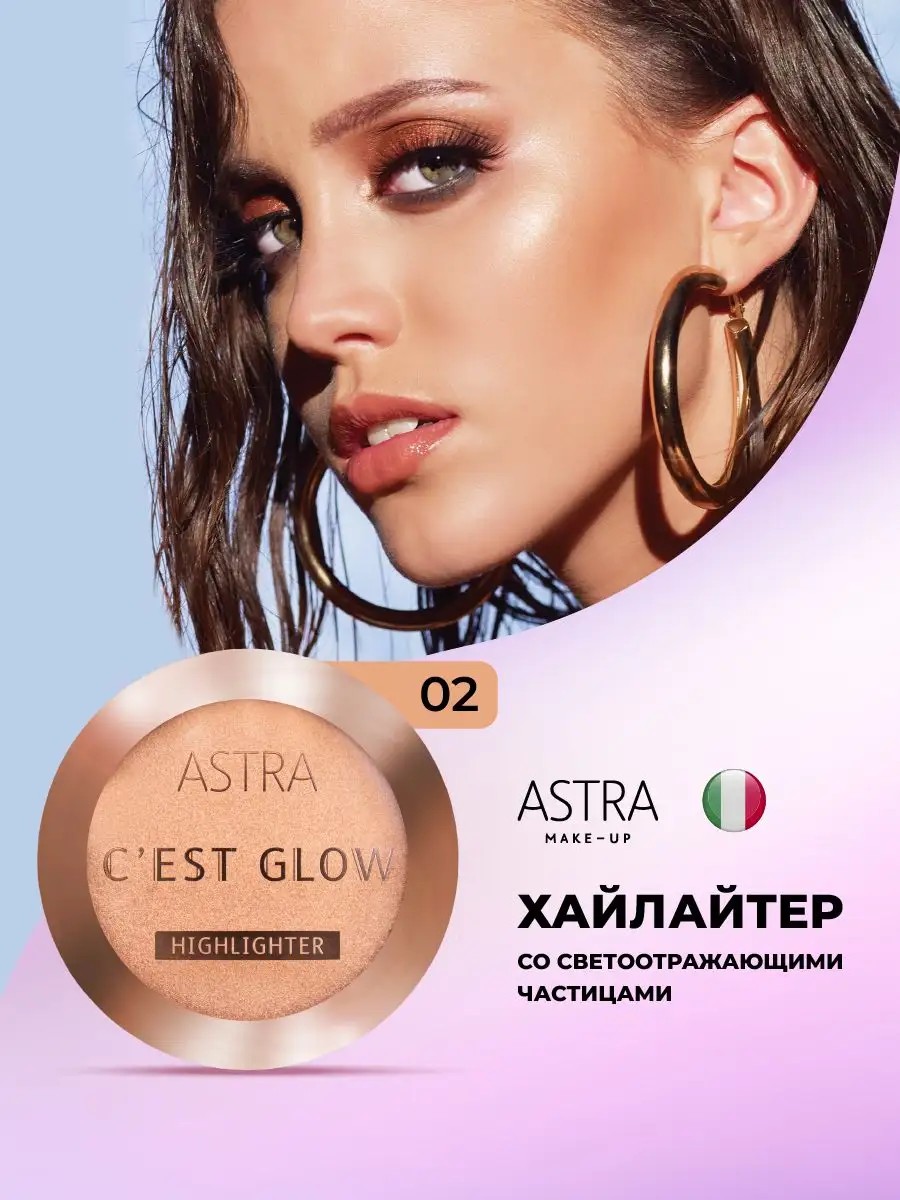 Хайлайтер для лица C’est Glow Highlighter - это продукт итальянского бренда Astra Make-up, который представлен в двух оттенках: 01 Radiant Privée (светлый-персиковый) и 02 Golden Privée (теплый-золотистый). Это компактный хайлайтер с мягкой и шелковистой текстурой, который легко наносится и растушевывается на коже. Он создает эффект естественного сияния, не подчеркивая поры и морщинки. Он также обогащен увлажняющими и питательными ингредиентами, такими как масло ши, масло жожоба и витамин Е. Сухой хайлайтер для лица подходит для всех типов кожи и может использоваться как на лице, так и на теле.