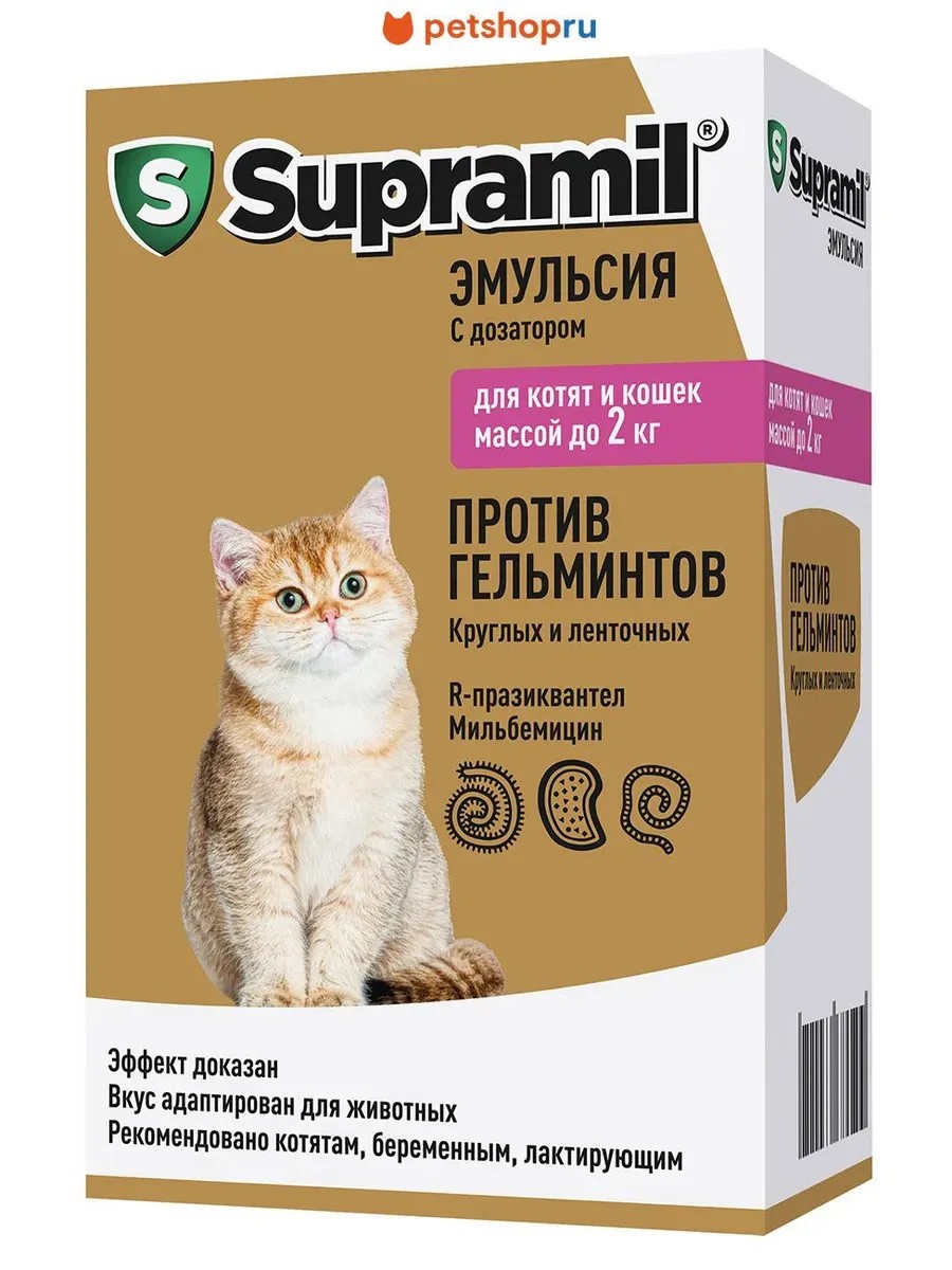 Supramil (Supramil) emulsion is the world's first broad-spectrum anthelmintic emulsion for kittens and cats, intended for the treatment and prevention of infection with round and tapeworms, as well as dirofilariasis.