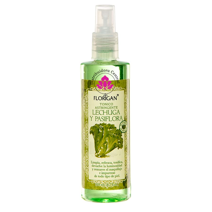 Astringent Cleaning Face Tonic Lechuga with Pasiflora Florigan 250ml. By Florigan Laboratories. An astringent tonic facial cleaner. Cleans, refreshes, tonifies and returns luminosity while removing makeup and impurities, safe for all skin types. Made with Lettuce and Pasiflora extracts.