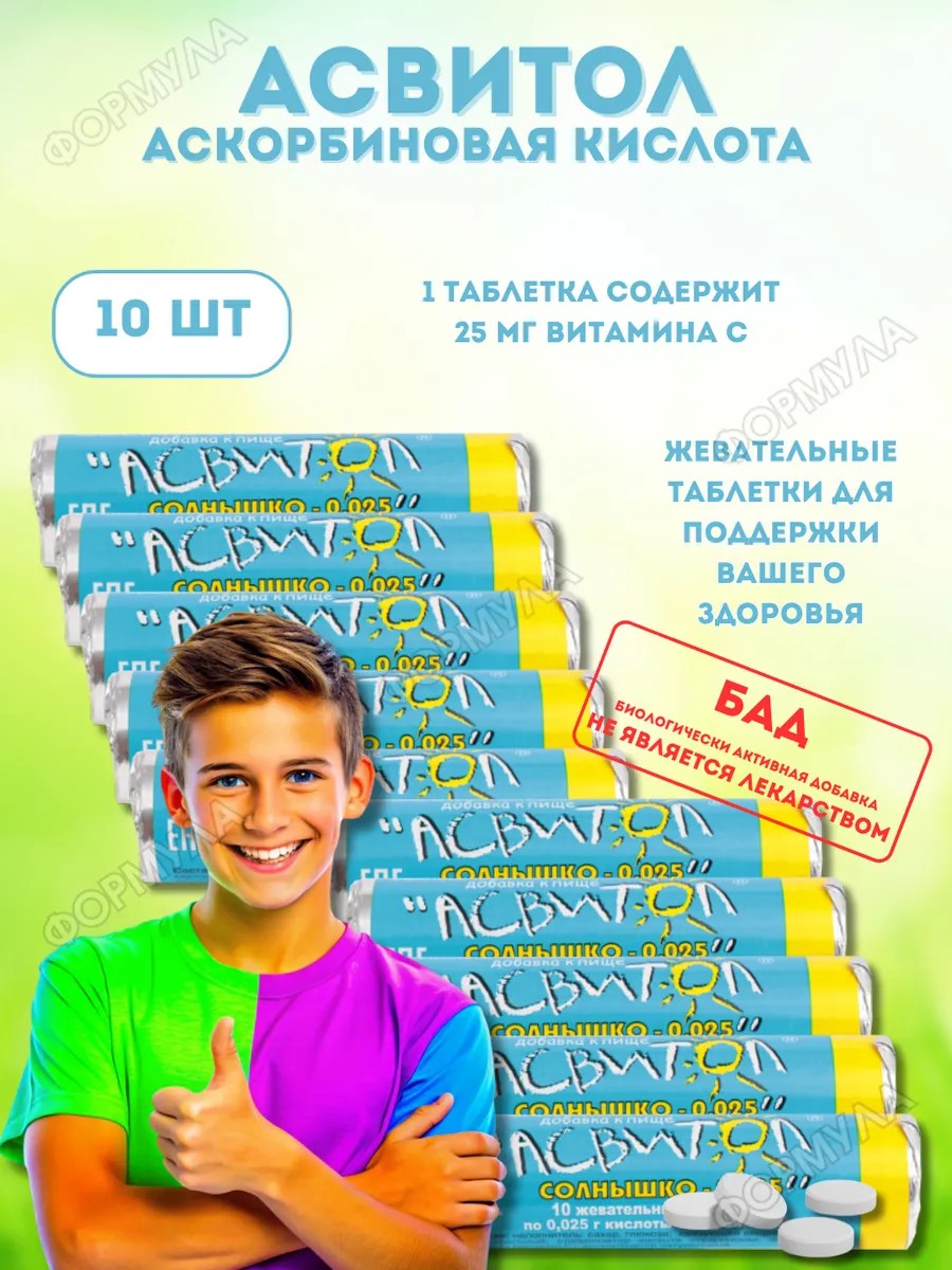 | Комплектация | асвитол солнышко 0,025 n10 табл жевать по 3г*10шт |