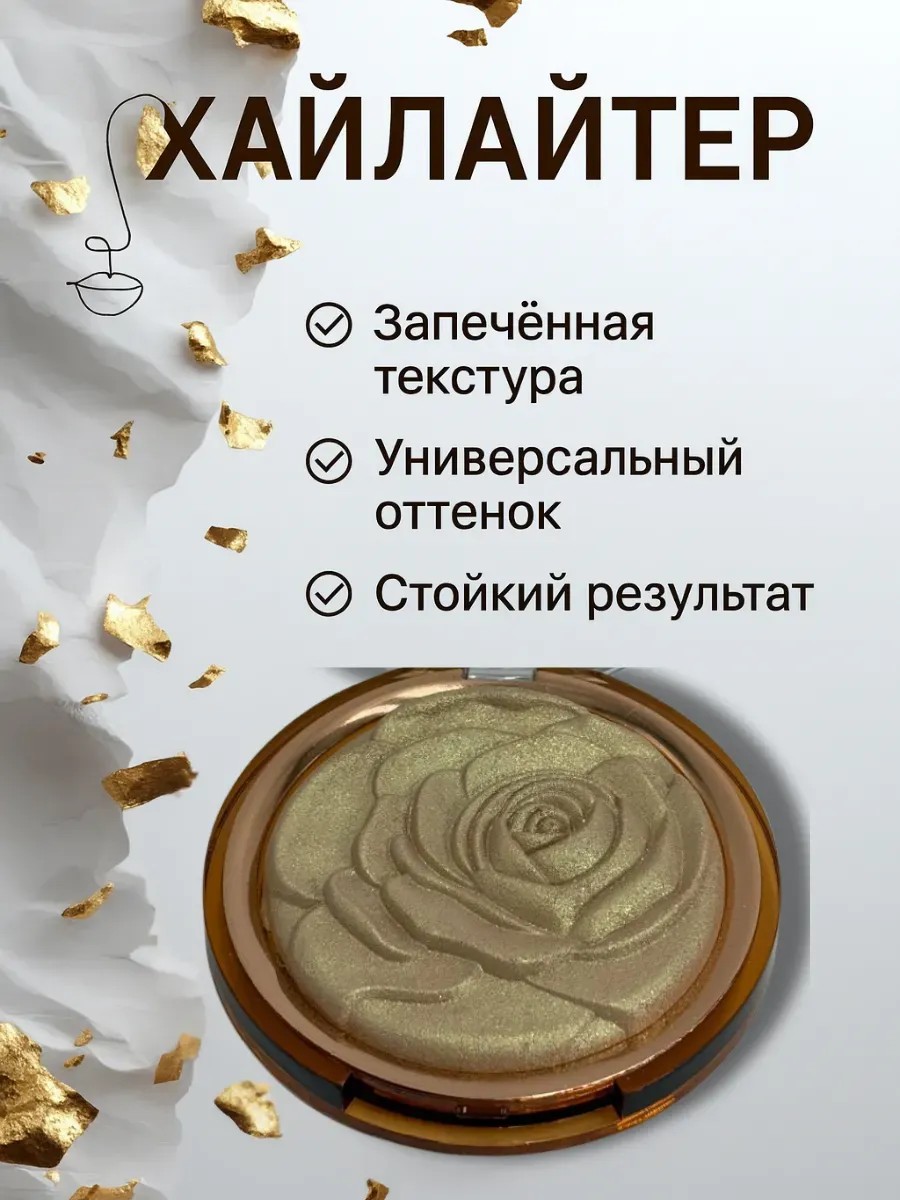 Идеальный макияж — это не только ровный тон, но и умелые акценты. Запечённый хайлайтер в форме роскошной розы создаст эффект "подсвеченной изнутри" кожи, придаст лицу свежесть, молодость и неповторимое сияние. Благодаря нежной золотисто-шампань текстуре он гармонично смотрится на любом типе кожи, подчёркивая достоинства и скрывая недостатки. Контуринг лица.